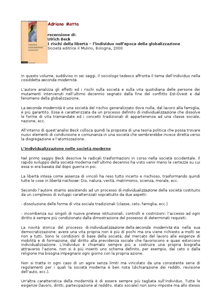 In questo volume, suddiviso in sei saggi, il sociologo tedesco affronta il tema dellindividuo nella cosiddetta seconda modernit. Lautore analizza gli effetti ed i rischi sulla societ e sulla vita quotidiana delle persone dei mutamenti intervenuti nellultimo decennio segnato dalla fine del conflitto Est-Ovest e dal fenomeno della globalizzazione. La seconda modernit una societ del rischio generalizzato dove nulla, dal lavoro alla famiglia, pi garantito. Essa caratterizzata da un processo definito di individualizzazione che dissolve le forme di vita tramandate ed i concetti tradizionali di appartenenza ad una classe sociale, nazione, ecc. Allinterno di questanalisi Beck colloca quindi la proposta di una teoria politica che possa trovare nuovi elementi di condivisione e comunanza in una societ che sembrerebbe invece diretta verso la disgregazione e latomizzazione. Lindividualizzazione nelle societ moderne Nel primo saggio Beck descrive le radicali trasformazioni in corso nella societ occidentale. Il rapido sviluppo della societ moderna nellultimo decennio ha visto venir meno le certezze su cui essa si era basata dal dopo guerra in poi. La libert intesa come assenza di vincoli ha reso tutto incerto e rischioso, trasformando quindi tutte le cose in libert rischiose: Dio, natura, verit, matrimonio, scienza, morale, ecc. Secondo lautore stiamo assistendo ad un processo di individualizzazione della societ costituito da un complesso di sviluppi caratterizzati soprattutto da due aspetti: - dissoluzione delle forme di vita sociale tradizionali (classe, ceto, famiglia, ecc.) - incombenza sui singoli di nuove pretese istituzionali, controlli e costrizioni: laccesso ad ogni diritto sempre pi condizionato dalla dimostrazione del possesso di determinati requisiti. La novit storica del processo di individualizzazione della seconda modernit sta nella sua democratizzazione: avere una vita propria non pi di pochi ma ora viene richiesto a molti se non a tutti. Sono le condizioni di base della societ, dal mercato del lavoro alle esigenze di mobilit e di formazione, dal diritto alla previdenza sociale che favoriscono e quasi estorcono individualizzazione. Lindividuo chiamato sempre pi a costruire una propria biografia attraverso lazione, non si pi inseriti uno schema definito, per esempio, dal ceto o dalla religione ma bisogna impegnarsi ogni giorno con la propria azione. Non si tratta in ogni caso di un agire senza limiti ma vincolato da una consistente serie di regolamenti per i quali la societ moderna ben nota (dichiarazione dei redditi, revisione dellauto, ecc.). Un'altra caratteristica della modernit di essere sempre pi tagliata sullindividuo. Tutte le esigenze (lavoro, diritti, partecipazione al reddito, stato sociale) non sono imposte ma allo stesso
