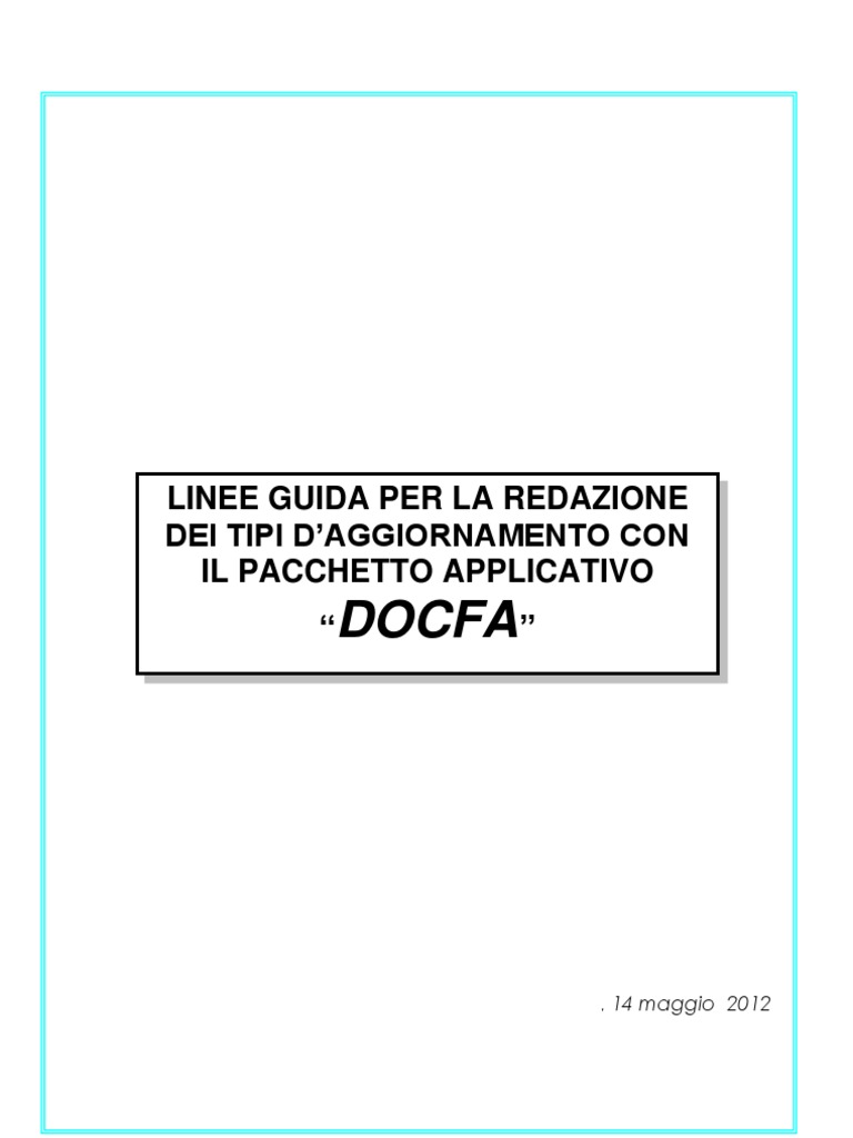 Queste linee guida non sono e non vogliono essere un trattato sulla disciplina catastale, ma hanno lo scopo di raccogliere e sintetizzare norme pratiche per la redazione dei documenti Docfa(Documento Catasto Fabbricati). Il pacchetto Docfa un prodotto informatico di ausilio ai tecnici professionisti per la compilazione e presentazione del modello di Accertamento della propriet immobiliare urbana Il modello sinteticamente pu essere descritto come costituito da: una parte descrittiva, di seguito denominata libretto Docfa, costituita dalle informazioni relative al mod.D, ai mod. 1N e 2N e documenti pregressi una parte grafica, di seguito denominata elaborati graficicostituita da planimetrie, da elaborato planimetrico e da elenco subalterni Conseguentemente sono organizzate nelle seguenti sezioni: A) LIBRETTO DOCFA 1) MOD. D 2) MOD 1N 2N 3) DOCUMENTI PREGRESSI B) ELABORATI GRAFICI 1) PLANIMETRIE 2) ELABORATO PLANIMETRICO 3) ELENCO SUBALTERNI C) APPROFONDIMENTI TECNICI 1) CAUSALI 2) CATEGORIE FITTIZIE 3) BENI COMUNI Nella sezione Approfondimenti tecnici sono stati approfonditi alcuni argomenti di specifici di interesse per la redazione dei documenti Docfa. La normativa principale di riferimento per gli argomenti trattati la seguente: Circolare del 19.01.1984 n.2 D.M. del 19.04.1994 n.701 Legge del 23/12/1996 n.662 D.P.R. del 23.03.1998 n.138 Circolare del 09.04.1999 n.83/E/T