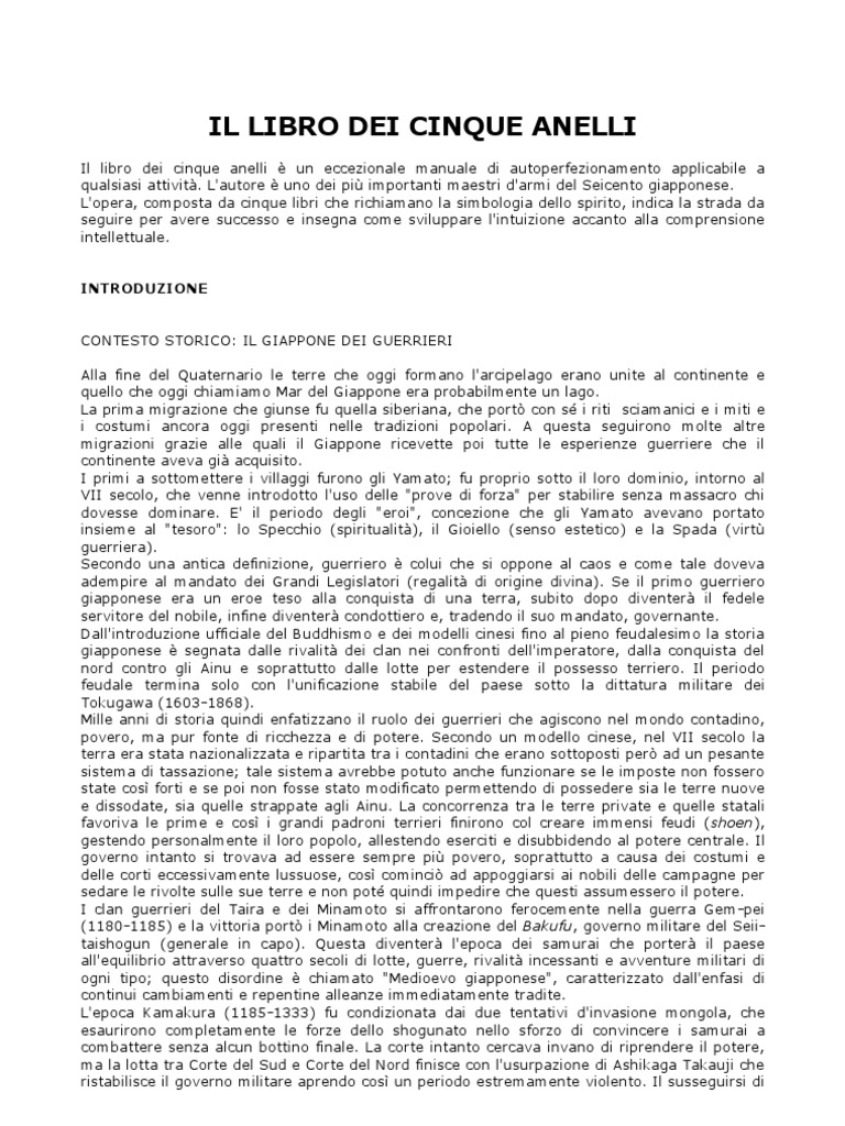 Il libro dei cinque anelli un eccezionale manuale di autoperfezionamento applicabile a qualsiasi attivit. L'autore uno dei pi importanti maestri d'armi del Seicento giapponese. L'opera, composta da cinque libri che richiamano la simbologia dello spirito, indica la strada da seguire per avere successo e insegna come sviluppare l'intuizione accanto alla comprensione intellettuale. INTRODUZIONE CONTESTO STORICO: IL GIAPPONE DEI GUERRIERI Alla fine del Quaternario le terre che oggi formano l'arcipelago erano unite al continente e quello che oggi chiamiamo Mar del Giappone era probabilmente un lago. La prima migrazione che giunse fu quella siberiana, che port con s i riti sciamanici e i miti e i costumi ancora oggi presenti nelle tradizioni popolari. A questa seguirono molte altre migrazioni grazie alle quali il Giappone ricevette poi tutte le esperienze guerriere che il continente aveva gi acquisito. I primi a sottomettere i villaggi furono gli Yamato; fu proprio sotto il loro dominio, intorno al VII secolo, che venne introdotto l'uso delle "prove di forza" per stabilire senza massacro chi dovesse dominare. E' il periodo degli "eroi", concezione che gli Yamato avevano portato insieme al "tesoro": lo Specchio (spiritualit), il Gioiello (senso estetico) e la Spada (virt guerriera). Secondo una antica definizione, guerriero colui che si oppone al caos e come tale doveva adempire al mandato dei Grandi Legislatori (regalit di origine divina). Se il primo guerriero giapponese era un eroe teso alla conquista di una terra, subito dopo diventer il fedele servitore del nobile, infine diventer condottiero e, tradendo il suo mandato, governante. Dall'introduzione ufficiale del Buddhismo e dei modelli cinesi fino al pieno feudalesimo la storia giapponese segnata dalle rivalit dei clan nei confronti dell'imperatore, dalla conquista del nord contro gli Ainu e soprattutto dalle lotte per estendere il possesso terriero. Il periodo feudale termina solo con l'unificazione stabile del paese sotto la dittatura militare dei Tokugawa (1603-1868). Mille anni di storia quindi enfatizzano il ruolo dei guerrieri che agiscono nel mondo contadino, povero, ma pur fonte di ricchezza e di potere. Secondo un modello cinese, nel VII secolo la terra era stata nazionalizzata e ripartita tra i contadini che erano sottoposti per ad un pesante sistema di tassazione; tale sistema avrebbe potuto anche funzionare se le imposte non fossero state cos forti e se poi non fosse stato modificato permettendo di possedere sia le terre nuove e dissodate, sia quelle strappate agli Ainu. La concorrenza tra le terre private e quelle statali favoriva le prime e cos i grandi padroni terrieri finirono col creare immensi feudi (shoen), gestendo personalmente il loro popolo, allestendo eserciti e disubbidendo al potere centrale. Il governo intanto si trovava ad essere sempre pi povero, soprattutto a causa dei costumi e delle corti eccessivamente lussuose, cos cominci ad appoggiarsi ai nobili delle campagne per sedare le rivolte sulle sue terre e non pot quindi impedire che questi assumessero il potere. I clan guerrieri del Taira e dei Minamoto si affrontarono ferocemente nella guerra Gem-pei (1180-1185) e la vittoria port i Minamoto alla creazione del Bakufu, governo militare del Seiitaishogun (generale in capo). Questa diventer l'epoca dei samurai che porter il paese all'equilibrio attraverso quattro secoli di lotte, guerre, rivalit incessanti e avventure militari di ogni tipo; questo disordine chiamato "Medioevo giapponese", caratterizzato dall'enfasi di continui cambiamenti e repentine alleanze immediatamente tradite. L'epoca Kamakura (1185-1333) fu condizionata dai due tentativi d'invasione mongola, che esaurirono completamente le forze dello shogunato nello sforzo di convincere i samurai a combattere senza alcun bottino finale. La corte intanto cercava invano di riprendere il potere, ma la lotta tra Corte del Sud e Corte del Nord finisce con l'usurpazione di Ashikaga Takauji che ristabilisce il governo militare aprendo cos un periodo estremamente violento. Il susseguirsi di