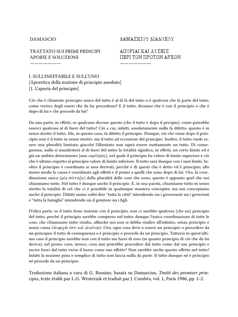 Traduzione italiana a cura di G. Russino, basata su Damascius, Trait des premiers principes, texte tabli par L.G. Westerink et traduit par J. Combs, vol. 1, Paris 1986, pp. 1-2.