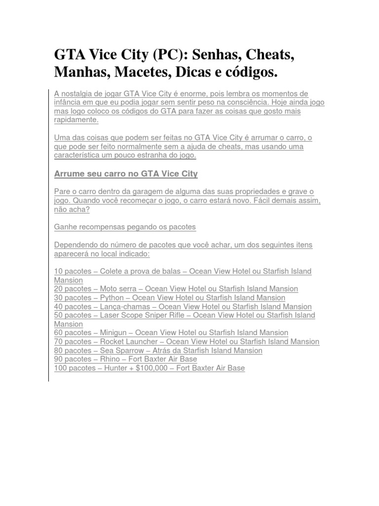 A nostalgia de jogar GTA Vice City enorme, pois lembra os momentos de infncia em que eu podia jogar sem sentir peso na conscincia. Hoje ainda jogo mas logo coloco os cdigos do GTA para fazer as coisas que gosto mais rapidamente. Uma das coisas que podem ser feitas no GTA Vice City arrumar o carro, o que pode ser feito normalmente sem a ajuda de cheats, mas usando uma caracterstica um pouco estranha do jogo.