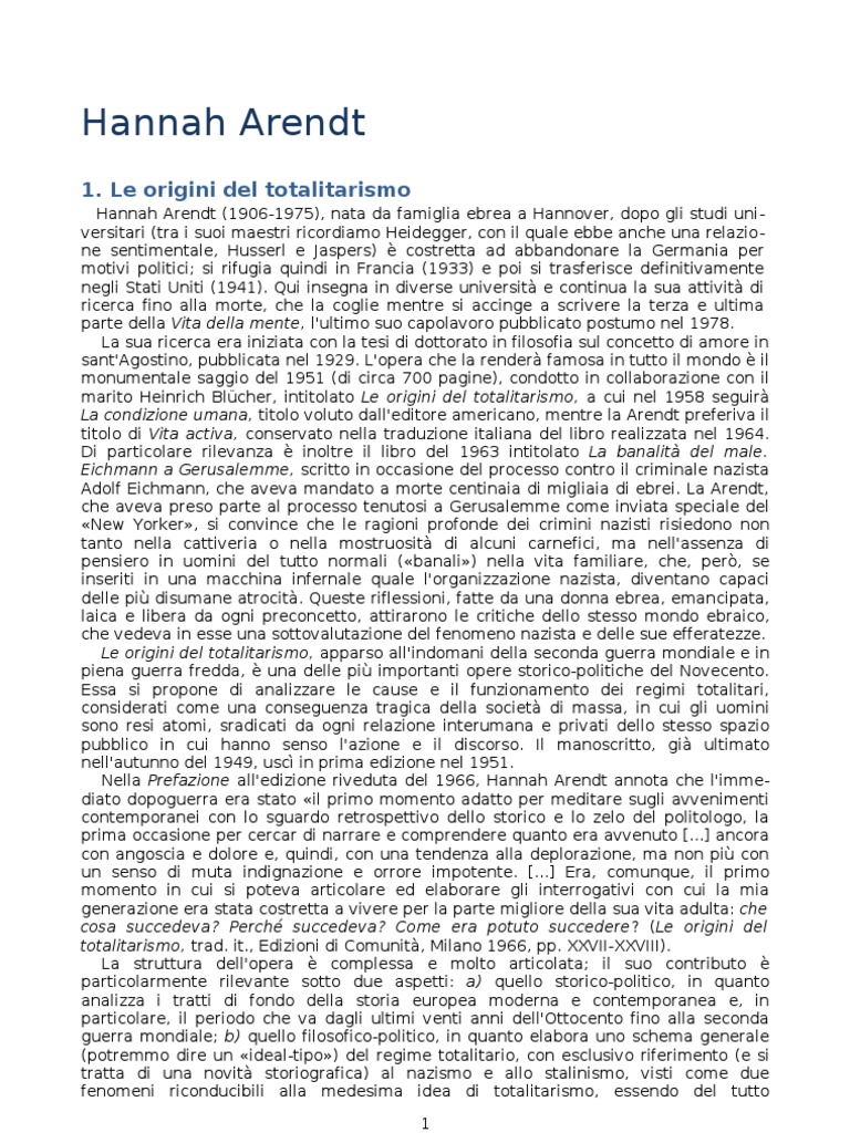 Novecento, il nazismo e lo stalinismo: esso ci rester probabilmente alle costole per l'avvenire. Le preoccupazioni della Arendt scrive Alberto Martinelli, nella Introduzione all'edizione italiana di Le origini del totalitarismo sono senza dubbio dettate dal trauma profondo suscitato dalle tragedie degli anni Trenta e della seconda guerra mondiale, ancora cos vicine al momento della stesura del libro, e possono apparire eccessive se riferite alle societ occidentali in generale e in particolare ai sistemi di pi antica democrazia di tipo anglosassone, che hanno sviluppato pi efficaci anticorpi contro le trasformazioni in senso totalitario. E tuttavia, come ci insegna la Arendt con la sua costante, appassionata attenzione a ogni manifestazione di sapore totalitario negli Stati Uniti d'America, come il maccartismo 2, nessun sistema politico contemporaneo del tutto immune da questo rischio degenerativo e la vigilanza in difesa della democrazia e della libert deve essere quindi costante. Le origini del totalitarismo nello stesso tempo un'analisi fondamentale della tragedia moderna e un'opera di educazione politica e civile, che va letta con grande attenzione e i apprezzata non solo come contributo fondamentale all'analisi degli eventi pi tragici della nostra epoca, ma ancor pi come antidoto contro il possibile riemergere nella societ contemporanea di tendenze totalitarie e della volont di rendere schiavi gli uomini in nome di astratte e perverse ideologie di trasformazione integrale dell'umanit.