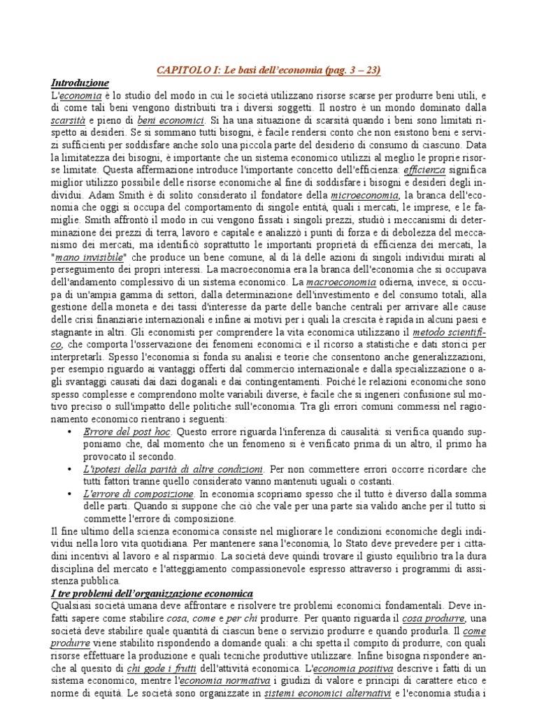 3 23) Introduzione L'economia lo studio del modo in cui le societ utilizzano risorse scarse per produrre beni utili, e di come tali beni vengono distribuiti tra i diversi soggetti. Il nostro un mondo dominato dalla scarsit e pieno di beni economici. Si ha una situazione di scarsit quando i beni sono limitati rispetto ai desideri. Se si sommano tutti bisogni, facile rendersi conto che non esistono beni e servizi sufficienti per soddisfare anche solo una piccola parte del desiderio di consumo di ciascuno. Data la limitatezza dei bisogni, importante che un sistema economico utilizzi al meglio le proprie risorse limitate. Questa affermazione introduce l'importante concetto dell'efficienza: efficienza significa miglior utilizzo possibile delle risorse economiche al fine di soddisfare i bisogni e desideri degli individui. Adam Smith di solito considerato il fondatore della microeconomia, la branca dell'economia che oggi si occupa del comportamento di singole entit, quali i mercati, le imprese, e le famiglie. Smith affront il modo in cui vengono fissati i singoli prezzi, studi i meccanismi di determinazione dei prezzi di terra, lavoro e capitale e analizz i punti di forza e di debolezza del meccanismo dei mercati, ma identific soprattutto le importanti propriet di efficienza dei mercati, la "mano invisibile" che produce un bene comune, al di l delle azioni di singoli individui mirati al perseguimento dei propri interessi. La macroeconomia era la branca dell'economia che si occupava dell'andamento complessivo di un sistema economico. La macroeconomia odierna, invece, si occupa di un'ampia gamma di settori, dalla determinazione dell'investimento e del consumo totali, alla gestione della moneta e dei tassi d'interesse da parte delle banche centrali per arrivare alle cause delle crisi finanziarie internazionali e infine ai motivi per i quali la crescita rapida in alcuni paesi e stagnante in altri. Gli economisti per comprendere la vita economica utilizzano il metodo scientifico, che comporta l'osservazione dei fenomeni economici e il ricorso a statistiche e dati storici per interpretarli. Spesso l'economia si fonda su analisi e teorie che consentono anche generalizzazioni, per esempio riguardo ai vantaggi offerti dal commercio internazionale e dalla specializzazione o agli svantaggi causati dai dazi doganali e dai contingentamenti. Poich le relazioni economiche sono spesso complesse e comprendono molte variabili diverse, facile che si ingeneri confusione sul motivo preciso o sull'impatto delle politiche sull'economia. Tra gli errori comuni commessi nel ragionamento economico rientrano i seguenti: Errore del post hoc. Questo errore riguarda l'inferenza di causalit: si verifica quando supponiamo che, dal momento che un fenomeno si verificato prima di un altro, il primo ha provocato il secondo. L'ipotesi della parit di altre condizioni. Per non commettere errori occorre ricordare che tutti fattori tranne quello considerato vanno mantenuti uguali o costanti. L'errore di composizione. In economia scopriamo spesso che il tutto diverso dalla somma delle parti. Quando si suppone che ci che vale per una parte sia valido anche per il tutto si commette l'errore di composizione. Il fine ultimo della scienza economica consiste nel migliorare le condizioni economiche degli individui nella loro vita quotidiana. Per mantenere sana l'economia, lo Stato deve prevedere per i cittadini incentivi al lavoro e al risparmio. La societ deve quindi trovare il giusto equilibrio tra la dura disciplina del mercato e l'atteggiamento compassionevole espresso attraverso i programmi di assistenza pubblica. I tre problemi dellorganizzazione economica Qualsiasi societ umana deve affrontare e risolvere tre problemi economici fondamentali. Deve infatti sapere come stabilire cosa, come e per chi produrre. Per quanto riguarda il cosa produrre, una societ deve stabilire quale quantit di ciascun bene o servizio produrre e quando produrla. Il come produrre viene stabilito rispondendo a domande quali: a chi spetta il compito di produrre, con quali risorse effettuare la produzione e quali tecniche produttive utilizzare. Infine bisogna rispondere anche al quesito di chi gode i frutti dell'attivit economica. L'economia positiva descrive i fatti di un sistema economico, mentre l'economia normativa i giudizi di valore e principi di carattere etico e norme di equit. Le societ sono organizzate in sistemi economici alternativi e l'economia studia i [Link] 1