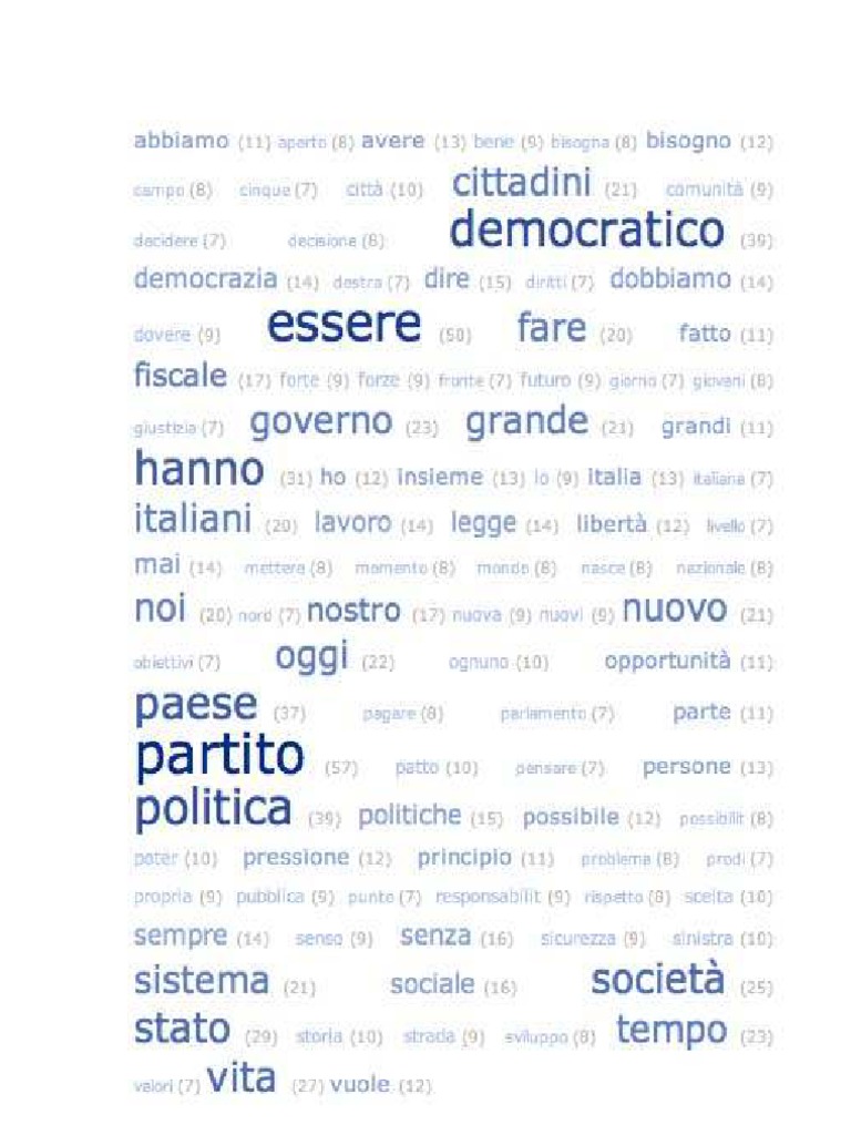usate con indicazione delle occorrenze. abbia (5) abbiamo (11) affitti (4) aliquote (5) allora (5) almeno (6) altro (5) ambientale (4) andare (4) aperto (8) aprirsi (4) aspettare (4) attraverso (5) avanti (4) avere (13) avuto (4) bambini (4) base (4) ben (6) bene (9) bipolarismo (5) bisogna (8) bisogno (12) cambiamenti (4) cambiamento (5) cambiare (5) cammino (6) campo (8) capacit (7) carico (4) casa (6) caso (5) certo (5) chiaro (4) chiedere (5) chiusa (4) cinque (7) citt (10) cittadini (21) cittadino (4) coloro (5) comuni (5) comunit (9) condizioni (4) confronto (6) contare (6) contribuenti (4) contro (6) coraggio (4) credo (6) crescere (4) crescita (6) cultura (5) culture (6) cuore (4) dare (6) davvero (5) decidere (7) decisione (8) democratici (7) democratico (39) democrazia (14) dentro (4) destra (7) devono (5) dice (4) difendere (4) difesa (4) dire (15) diritti (7) diritto (7) distanza (4) diventa (4) diventare (6) diverse (6) dobbiamo (14) donne (5) dopo (5) dovere (9) economica (5) economico (4) elettorale (6) elezioni (4) era (5) esempio (7) esperienza (4) essere (50) europa (4)