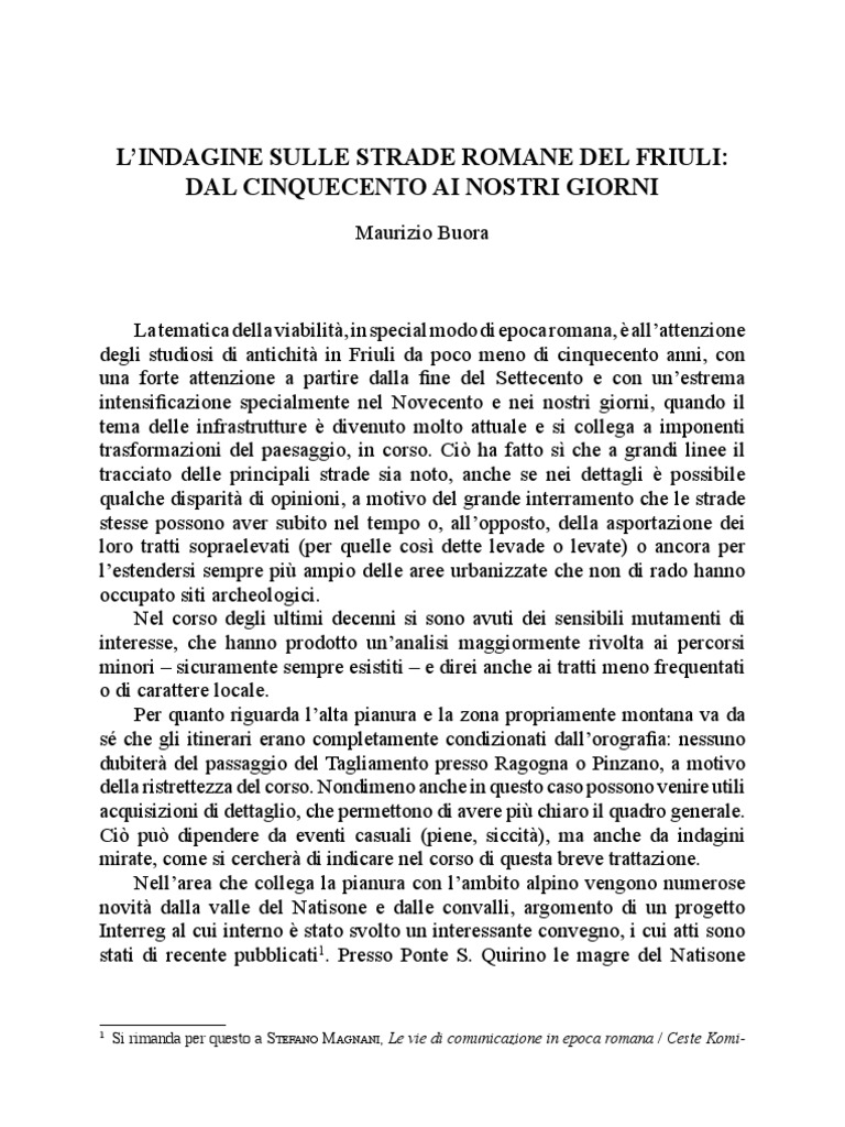 La tematica della viabilit, in special modo di epoca romana, allattenzione degli studiosi di antichit in Friuli da poco meno di cinquecento anni, con una forte attenzione a partire dalla fine del Settecento e con unestrema intensificazione specialmente nel Novecento e nei nostri giorni, quando il tema delle infrastrutture divenuto molto attuale e si collega a imponenti trasformazioni del paesaggio, in corso. ci ha fatto s che a grandi linee il tracciato delle principali strade sia noto, anche se nei dettagli possibile qualche disparit di opinioni, a motivo del grande interramento che le strade stesse possono aver subito nel tempo o, allopposto, della asportazione dei loro tratti sopraelevati (per quelle cos dette levade o levate) o ancora per lestendersi sempre pi ampio delle aree urbanizzate che non di rado hanno occupato siti archeologici. nel corso degli ultimi decenni si sono avuti dei sensibili mutamenti di interesse, che hanno prodotto unanalisi maggiormente rivolta ai percorsi minori sicuramente sempre esistiti e direi anche ai tratti meno frequentati o di carattere locale. Per quanto riguarda lalta pianura e la zona propriamente montana va da s che gli itinerari erano completamente condizionati dallorografia: nessuno dubiter del passaggio del Tagliamento presso Ragogna o Pinzano, a motivo della ristrettezza del corso. nondimeno anche in questo caso possono venire utili acquisizioni di dettaglio, che permettono di avere pi chiaro il quadro generale. ci pu dipendere da eventi casuali (piene, siccit), ma anche da indagini mirate, come si cercher di indicare nel corso di questa breve trattazione. nellarea che collega la pianura con lambito alpino vengono numerose novit dalla valle del natisone e dalle convalli, argomento di un progetto Interreg al cui interno stato svolto un interessante convegno, i cui atti sono stati di recente pubblicati1. Presso Ponte S. Quirino le magre del natisone