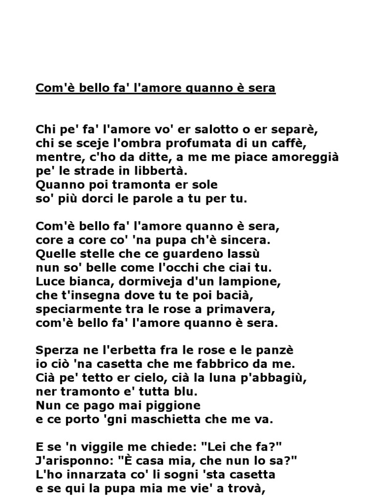 e l'ombra profumata di un caff, mentre, c'ho da ditte, a me me piace amoreggi pe' le strade in libbert. Quanno poi tramonta er sole so' pi dorci le parole a tu per tu. Com' bello fa' l'amore quanno sera, core a core co' 'na pupa ch' sincera. Quelle stelle che ce guardeno lass nun so' belle come l'occhi che ciai tu. Luce bianca, dormiveja d'un lampione, che t'insegna dove tu te poi baci, speciarmente tra le rose a primavera, com' bello fa' l'amore quanno sera. Sperza ne l'erbetta fra le rose e le panz io ci 'na casetta che me fabbrico da me. Ci pe' tetto er cielo, ci la luna p'abbagi, ner tramonto e' tutta blu. Nun ce pago mai piggione e ce porto 'gni maschietta che me va. E se 'n viggile me chiede: "Lei che fa?" J'arisponno: " casa mia, che nun lo sa?" L'ho innarzata co' li sogni 'sta casetta e se qui la pupa mia me vie' a trov,