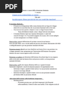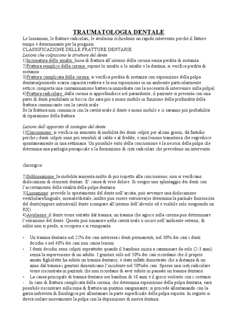 Le lussazioni, le fratture radicolari, le avulsioni richiedono un rapido intervento perch il fattore tempo determinante per la prognosi. CLASSIFICAZIONE DELLE FRATTURE DENTARIE Lesioni che colpiscono le strutture del dente 1)Incrinatura dello smalto: linea di frattura allinterno della corona senza perdita di sostanza 2)Frattura semplice della corona: espone lo smalto o lo smalto e la dentina; si verifica perdita di sostanza 3)Frattura complicata della corona: si verifica perdita di sostanza con esposizione della polpa dentaria(possiede scarsa capacit reattiva e la sua esposizione in un ambiente particolarmente settico comporta una contaminazione batterica immediata con la necessit di intervenire sulla polpa) 4)Frattura radicolare: dalla corona si approfondisce nel paraodonto; il paziente si presenta con una parte di denti pendolanti in bocca che sar pi o meno mobile in funzione della profondit della frattura comunicante con la cavit orale. Se la frattura non comunica con la cavit orale il dente meno mobile e ci saranno pi probabilit di riparazione della frattura Lesioni dellapparato di sostegno del dente 1)Concussione: si verifica un aumento di mobilit dei denti colpiti per alcuni giorni; d fastidio perch i denti colpiti sono pi sensibili al caldo e al freddo; una lesione transitoria che regredisce spontaneamente in una settimana. Un possibile esito della concussione la necrosi della polpa che determina una paologia periapicale o la formazione di cisti radicolari che prevedono un intervento chirurgico 2)Sublussazione: la mobilit aumenta molto di pi rispetto alla concussione; non si verificano dislocazioni di elementi dentari. E causa di vivo dolore. Si esegue uno splintaggio dei denti con laccertamento della vitalit della polpa dentaria. 3)Lussazione: prevede lo spostamento del dente nellarcata; pu avvenire una dislocazione vestibolare/linguale; mesiale/distale; inoltre pu essere estrusiva(se determina la parziale fuoriuscita del dente)oppure intrusiva(il dente scompare allinterno dellalveolo ed visibile solo eseguendo un RX) 4)Avulsione: il dente viene estratto dal trauma; un trauma che agisce sulla corona pu determinare lestrazione del dente. Questo pu rimanere nella cavit orale o uscire nellambiente esterno; di solito non si perde, si recupera e si reimpianta. Un trauma dentario nel 22% dei casi interessa i denti permanenti, nel 30% dei casi i denti decidui e nel 48% dei casi non causa lesioni. - I denti decidui sono colpiti soprattutto quando il bambino inizia a camminare da solo (2-3 anni) senza la supervisione di un adulto. I genitori solo nel 50% dei casi ricordano che il proprio amato figlioletto ha subito un trauma dentario; stato infatti dimostrato che a distanza di un anno dal trauma i genitori dimenticano lincidente nel 50%dei casi. Spesso una cisti radicolare viene riscontrata in pazienti che non ricordano di aver subito in passato un trauma dentario. - La causa principale di trauma dentario nei bambini di 10 anni il gioco violento con i coetanei. - In caso di frattura complicata della corona, che determina esposizione della polpa dentaria, sar possibile riscontrare sulla rima di frattura un puntino sanguinante; si procede allontanando con la garza imbevuta di fisiologica per allontanare la parte superficiale della polpa esposta. In seguito si dovr isolare nuovamente la polpa con la deposizione di nuova dentina. -