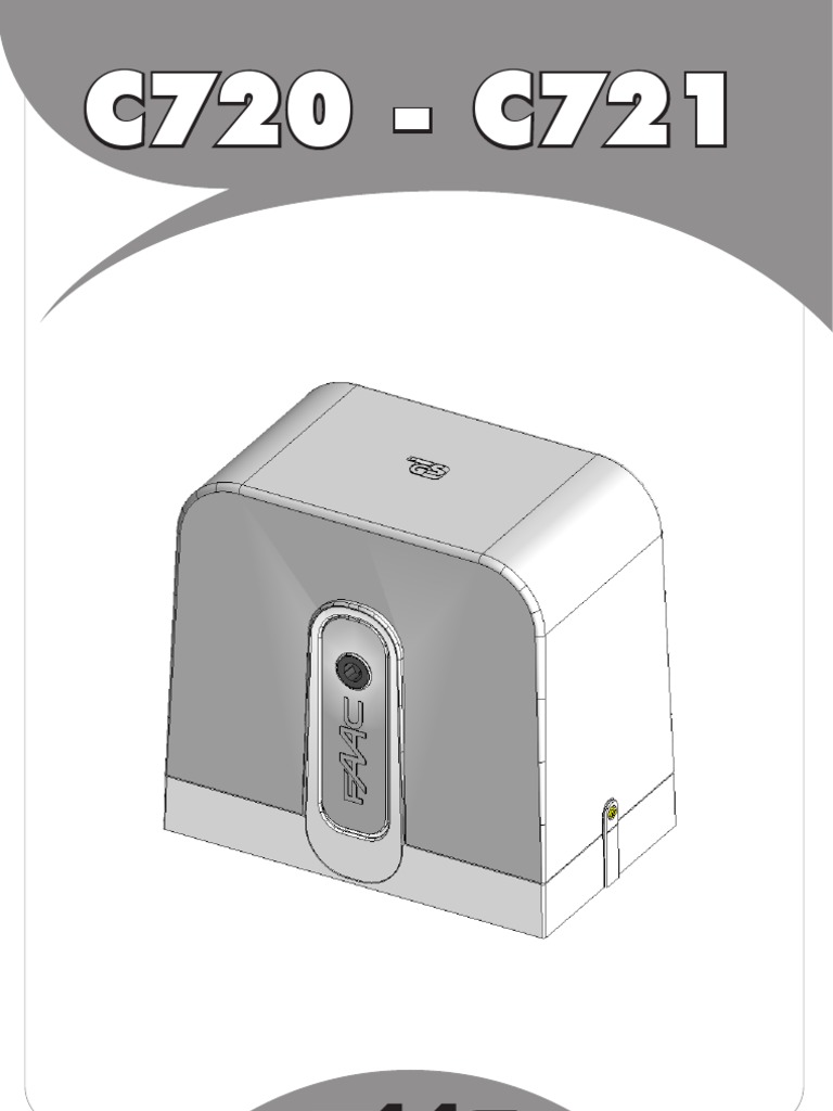 C720 - C721 I modelli sopra indicati sono operatori elettromeccanici studiati per la movimentazione di cancelli scorrevoli, differenti tra loro per diverse caratteristiche e specifiche tecniche. Un pratico e funzionale blocco meccanico, che agisce direttamente sul motore, garantisce il blocco del cancello quando loperatore non in funzione, quindi non occorre installare alcuna elettroserratura. Un comodo dispositivo di sblocco manuale rende manovrabile il cancello in caso di black-out, nel caso non siano state installate le batterie di emergenza, o di disservizio delloperatore. Questi operatori, oltre ad avere diverse caratteristiche e specifiche tecniche, si differenziano per i seguenti componenti : motore (pi grande nel C721), trasformatore (pi grande nel C721), pignone (materiali differenti), leva di sblocco (colori differenti). Questa istruzione di montaggio, se non diversamente specificato, valida per entrambi i modelli.