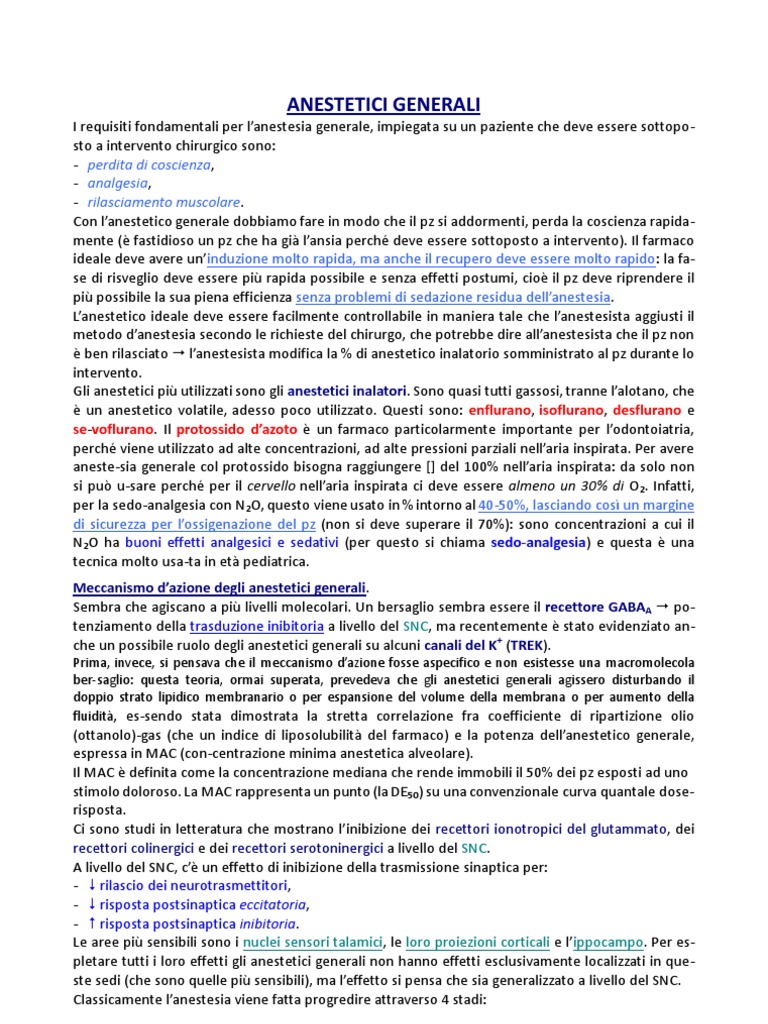 I requisiti fondamentali per lanestesia generale, impiegata su un paziente che deve essere sottoposto a intervento chirurgico sono: - perdita di coscienza, - analgesia, - rilasciamento muscolare. Con lanestetico generale dobbiamo fare in modo che il pz si addormenti, perda la coscienza rapidamente ( fastidioso un pz che ha gi lansia perch deve essere sottoposto a intervento). Il farmaco ideale deve avere uninduzione molto rapida, ma anche il recupero deve essere molto rapido: la fase di risveglio deve essere pi rapida possibile e senza effetti postumi, cio il pz deve riprendere il pi possibile la sua piena efficienza senza problemi di sedazione residua dellanestesia. Lanestetico ideale deve essere facilmente controllabile in maniera tale che lanestesista aggiusti il metodo danestesia secondo le richieste del chirurgo, che potrebbe dire allanestesista che il pz non ben rilasciato lanestesista modifica la % di anestetico inalatorio somministrato al pz durante lo intervento. Gli anestetici pi utilizzati sono gli anestetici inalatori. Sono quasi tutti gassosi, tranne lalotano, che un anestetico volatile, adesso poco utilizzato. Questi sono: enflurano, isoflurano, desflurano e se-voflurano. Il protossido dazoto un farmaco particolarmente importante per lodontoiatria, perch viene utilizzato ad alte concentrazioni, ad alte pressioni parziali nellaria inspirata. Per avere aneste-sia generale col protossido bisogna raggiungere [] del 100% nellaria inspirata: da solo non si pu u-sare perch per il cervello nellaria inspirata ci deve essere almeno un 30% di O2. Infatti, per la sedo-analgesia con N2O, questo viene usato in % intorno al 40-50%, lasciando cos un margine di sicurezza per lossigenazione del pz (non si deve superare il 70%): sono concentrazioni a cui il N2O ha buoni effetti analgesici e sedativi (per questo si chiama sedo-analgesia) e questa una tecnica molto usa-ta in et pediatrica. Meccanismo dazione degli anestetici generali. Sembra che agiscano a pi livelli molecolari. Un bersaglio sembra essere il recettore GABAA potenziamento della trasduzione inibitoria a livello del SNC, ma recentemente stato evidenziato anche un possibile ruolo degli anestetici generali su alcuni canali del K+ (TREK).