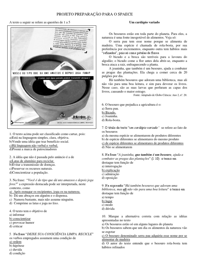 6. O besouro que prejudica a agricultura o: a) Serra pau. b) Bicudo. c) Joaninha. d) Rola-bosta. 7. O ttulo do texto um cardpio variado se refere ao fato de os besouros a) da mesma espcie se alimentarem de produtos diferentes b) de espcie diferentes se alimentares do mesmo produto c) de espcie diferentes se alimentares de produtos diferentes d) No se alimentarem 8. Na frase A joaninha, que tambm um besouro, ajuda a combater as pragas das plantaes (l. 10) o termo em destaque tem funo de a) interrogao b) explicao c) admirao d) oposio 9. Na expresso H tambm besouros que adoram uma biblioteca, mas ali no vo para uma boa leitura o termo em destaque tem funo de a) tempo b) lugar c) modo d) dvida 10. Marque a alternativa correta com relao as idias apresentadas no texto a) Os besouros esto s em alguns lugares do planeta b) Os besouros sabem que um dia os alimentos da natureza vo se esgotar c) O besouro denominado serra pau adquiriu esse nome por se alimentar de madeira d) O autor do texto entende que o besouro rola-bosta tem hbitos refinados