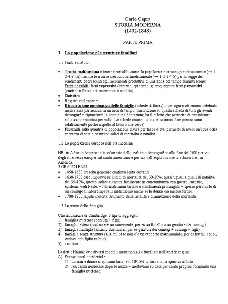 1.2 La popolazione europea nellet moderna NB: in Africa e America c unarresto dello sviluppo demografico alla fine del 500 per via degli interventi europei sul suolo americano e per via dellesportazione di schiavi neri in America. 3 GRANDI FASI: 1450-1630 crescita generale continua lenta costante 1630-1700 calo improvviso: indici di mortalit del 30-35%, quasi uguali a quelli di natalit, del 35-40%; questo indice aumenta facilmente in concomitanza con guerre, carestie, epidemi: vedi Peste; + NB matrimoni tardivi e allattamenti prolungati, + spesso per morte di un coniuge si interrompeva il matrimonio anche se la donna era ancora fertile. 1700-1800 rapida crescita. Aumento della natalit e diminuzione della mortalit. 1.3 La storia della famiglia. Classificazione di Cambridge: 5 tipi di aggregati: 1) famiglia nucleare (coniugi + figli) 2) famiglia estesa (nucleare + un convivente, per es un fratello o un genitore dei coniugi) 3) famiglia multipla (almeno due nuclei, per es genitori dei coniugi + coniugi + figli) 4) famiglie senza struttura (alla cui base non c un rapporto matrimoniale, per es fratelli celibi, vedova con figlia nubile) 5) i solitari. Laslett e Hajnal: due diversi modelli matrimoniali e familiari nellancin regime: A) Europa nord-occidentale: 1) uomini e donne si sposano tardi, e il 10/15% di loro non si sposava affatto 2) residenza neolocale dopo le nozze = mettevano su casa per conto proprio, formando una famiglia nucleare.