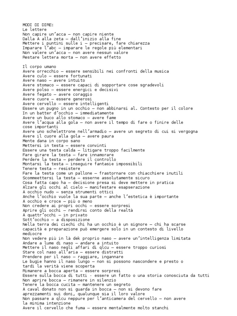 ne Mettere i puntini sulle i precisare, fare chiarezza Imparare labc imparare le regole pi elementari Non valere unacca non avere nessun valore Restare lettera morta non avere effetto Il corpo umano Avere orrecchio essere sensibili nei confronti della musica Avere culo essere fortunati Avere naso avere intuito Avere stomaco essere capaci di sopportare cose sgradevoli Avere polso essere energici e decisivi Avere fegato avere coraggio Avere cuore essere generosi Avere cervello essere intelligenti Essere un pugno in un occhio non abbinarsi al. Contesto per il colore In un batter docchio immediatamente Avere un buco allo stomaco avere fame Avere lacqua alla gola non avere il tempo di fare o finire delle cose importanti Avere uno schelettrone nellarmadio avere un segreto di cui si vergogna Avere il cuore alla gola avere paura Mente dana in corpo sano Mettersi in testa essere convinti Essere una testa calda litigare troppo facilmente Fare girare la testa fare innamorare Perdere la testa perdere il controllo Montarsi la testa inseguire fantasie impossibili Tenere testa resistere Fare la testa come un pallone frastornare con chiacchiere inutili Scommeettersi la testa esserne assolutamente sicuro Cosa fatta capo ha decisione presa si deve mettere in pratica Alzare gli occhi al cielo manifestare esapserazione A occhio nudo senza strumenti ottici Anche locchio vuole la sua parte anche lestetica importante A occhio e croce pi o meno Non credere ai propri occhi essere sorpresi Aprire gli occhi rendirsi conto della realt A quattrocchi in privato Sottocchio a disposizione Nella terra dei ciechi chi ha un occhio un signore chi ha scarse capacit e preparazione pu emergere solo in un contesto di livello mediocre Non vedere pi in l dek proprio naso avere unintelligenza limitata Andare a lume di naso andare a intuito Mettere il naso negli affari di qlcu essere troppo curiosi Stare col naso allaria essere distratti Prendere per il naso raggiare, ingannare Le bugie hanno il naso lungo non si possono nascondere e presto o tardi la verit viene scoperta Rimanere a bocca aperta essere sorpresi Essere sulla bocca di tutti - essere un fatto o una storia conosciuta da tutti Non aprire bocca rimanere in silenzio Tenere la bocca cucita mantenere un segreto A caval donato non si guarda in bocca non si devono fare aprezzamenti sui doni, qualunque sia il loro valore Non passare a qlcu neppure per lanticamera del cervello non avere la minima intenzione Avere il cervello che fuma essere mentalmente molto stanchi
