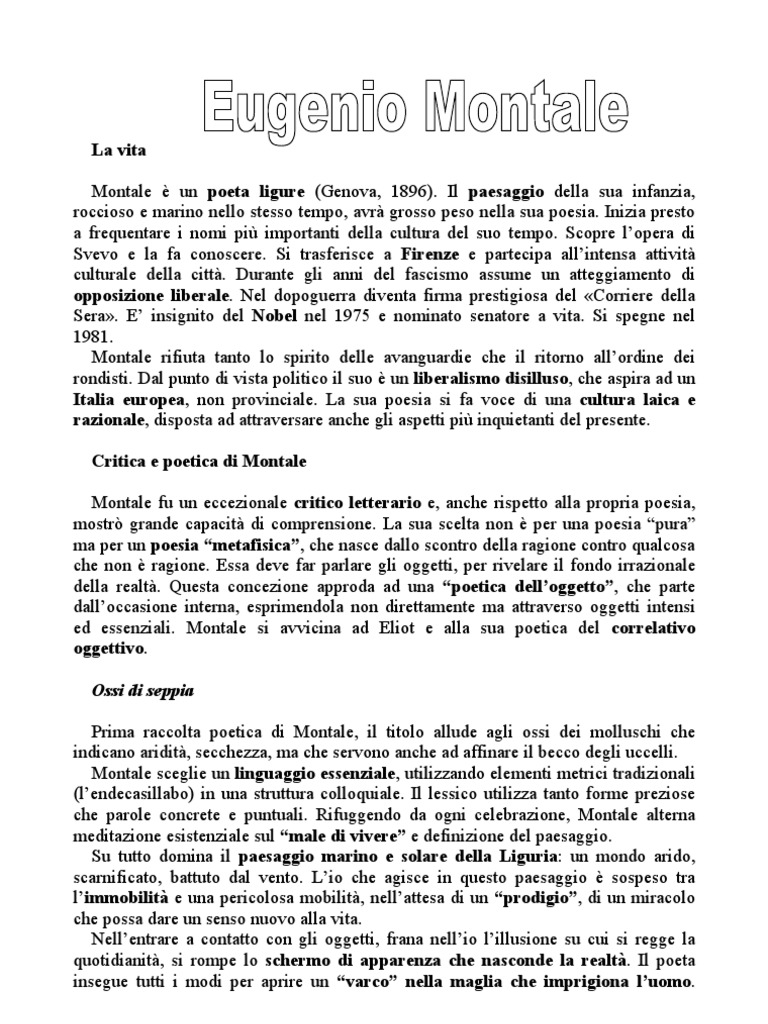 . Il paesaggio della sua infanzia, roccioso e marino nello stesso tempo, avr grosso peso nella sua poesia. Inizia presto a frequentare i nomi pi importanti della cultura del suo tempo. Scopre lopera di Svevo e la fa conoscere. Si trasferisce a Firenze e partecipa allintensa attivit culturale della citt. Durante gli anni del fascismo assume un atteggiamento di opposizione liberale. Nel dopoguerra diventa firma prestigiosa del Corriere della Sera. E insignito del Nobel nel 1975 e nominato senatore a vita. Si spegne nel 1981. Montale rifiuta tanto lo spirito delle avanguardie che il ritorno allordine dei rondisti. Dal punto di vista politico il suo un liberalismo disilluso, che aspira ad un Italia europea, non provinciale. La sua poesia si fa voce di una cultura laica e razionale, disposta ad attraversare anche gli aspetti pi inquietanti del presente. Critica e poetica di Montale Montale fu un eccezionale critico letterario e, anche rispetto alla propria poesia, mostr grande capacit di comprensione. La sua scelta non per una poesia pura ma per un poesia metafisica, che nasce dallo scontro della ragione contro qualcosa che non ragione. Essa deve far parlare gli oggetti, per rivelare il fondo irrazionale della realt. Questa concezione approda ad una poetica delloggetto, che parte dalloccasione interna, esprimendola non direttamente ma attraverso oggetti intensi ed essenziali. Montale si avvicina ad Eliot e alla sua poetica del correlativo oggettivo. Ossi di seppia Prima raccolta poetica di Montale, il titolo allude agli ossi dei molluschi che indicano aridit, secchezza, ma che servono anche ad affinare il becco degli uccelli. Montale sceglie un linguaggio essenziale, utilizzando elementi metrici tradizionali (lendecasillabo) in una struttura colloquiale. Il lessico utilizza tanto forme preziose che parole concrete e puntuali. Rifuggendo da ogni celebrazione, Montale alterna meditazione esistenziale sul male di vivere e definizione del paesaggio. Su tutto domina il paesaggio marino e solare della Liguria: un mondo arido, scarnificato, battuto dal vento. Lio che agisce in questo paesaggio sospeso tra limmobilit e una pericolosa mobilit, nellattesa di un prodigio, di un miracolo che possa dare un senso nuovo alla vita. Nellentrare a contatto con gli oggetti, frana nellio lillusione su cui si regge la quotidianit, si rompe lo schermo di apparenza che nasconde la realt. Il poeta insegue tutti i modi per aprire un varco nella maglia che imprigiona luomo.