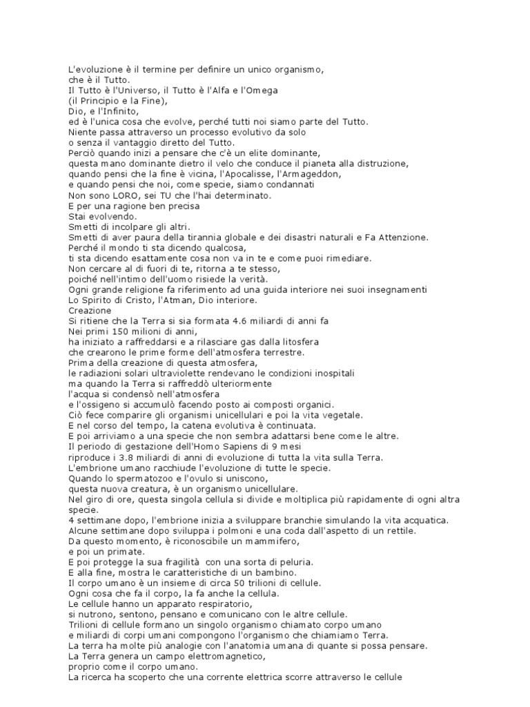 o. Il Tutto l'Universo, il Tutto l'Alfa e l'Omega (il Principio e la Fine), Dio, e l'Infinito, ed l'unica cosa che evolve, perch tutti noi siamo parte del Tutto. Niente passa attraverso un processo evolutivo da solo o senza il vantaggio diretto del Tutto. Perci quando inizi a pensare che c' un elite dominante, questa mano dominante dietro il velo che conduce il pianeta alla distruzione, quando pensi che la fine vicina, l'Apocalisse, l'Armageddon, e quando pensi che noi, come specie, siamo condannati Non sono LORO, sei TU che l'hai determinato. E per una ragione ben precisa Stai evolvendo. Smetti di incolpare gli altri. Smetti di aver paura della tirannia globale e dei disastri naturali e Fa Attenzione. Perch il mondo ti sta dicendo qualcosa, ti sta dicendo esattamente cosa non va in te e come puoi rimediare. Non cercare al di fuori di te, ritorna a te stesso, poich nell'intimo dell'uomo risiede la verit. Ogni grande religione fa riferimento ad una guida interiore nei suoi insegnamenti Lo Spirito di Cristo, l'Atman, Dio interiore. Creazione Si ritiene che la Terra si sia formata 4.6 miliardi di anni fa Nei primi 150 milioni di anni, ha iniziato a raffreddarsi e a rilasciare gas dalla litosfera che crearono le prime forme dell'atmosfera terrestre. Prima della creazione di questa atmosfera, le radiazioni solari ultraviolette rendevano le condizioni inospitali ma quando la Terra si raffredd ulteriormente l'acqua si condens nell'atmosfera e l'ossigeno si accumul facendo posto ai composti organici. Ci fece comparire gli organismi unicellulari e poi la vita vegetale. E nel corso del tempo, la catena evolutiva continuata. E poi arriviamo a una specie che non sembra adattarsi bene come le altre. Il periodo di gestazione dell'Homo Sapiens di 9 mesi riproduce i 3.8 miliardi di anni di evoluzione di tutta la vita sulla Terra. L'embrione umano racchiude l'evoluzione di tutte le specie. Quando lo spermatozoo e l'ovulo si uniscono, questa nuova creatura, un organismo unicellulare. Nel giro di ore, questa singola cellula si divide e moltiplica pi rapidamente di ogni altra specie. 4 settimane dopo, l'embrione inizia a sviluppare branchie simulando la vita acquatica. Alcune settimane dopo sviluppa i polmoni e una coda dall'aspetto di un rettile. Da questo momento, riconoscibile un mammifero, e poi un primate. E poi protegge la sua fragilit con una sorta di peluria. E alla fine, mostra le caratteristiche di un bambino. Il corpo umano un insieme di circa 50 trilioni di cellule. Ogni cosa che fa il corpo, la fa anche la cellula. Le cellule hanno un apparato respiratorio, si nutrono, sentono, pensano e comunicano con le altre cellule. Trilioni di cellule formano un singolo organismo chiamato corpo umano e miliardi di corpi umani compongono l'organismo che chiamiamo Terra. La terra ha molte pi analogie con l'anatomia umana di quante si possa pensare. La Terra genera un campo elettromagnetico, proprio come il corpo umano. La ricerca ha scoperto che una corrente elettrica scorre attraverso le cellule