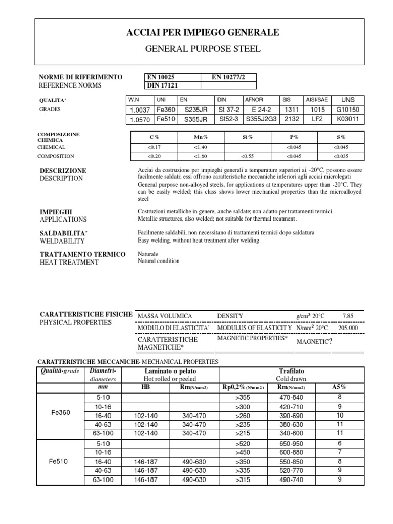 Acciai da costruzione per impieghi generali a temperature superiori ai -20C, possono essere facilmente saldati; essi offrono caratteristiche meccaniche inferiori agli acciai microlegati General purpose non-alloyed steels, for applications at temperatures upper than -20C. They can be easily welded; this class shows lower mechanical properties than the microalloyed steel Costruzioni metalliche in genere, anche saldate; non adatto per trattamenti termici. Metallic structures, also welded; not suitable for thermal treatment. Facilmente saldabili, non necessitano di trattamenti termici dopo saldatura Easy welding, without heat treatment after welding Naturale Natural condition