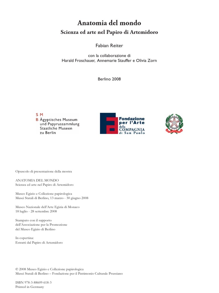 Il Museo Egizio e la Collezione Papirologica di Berlino, una doppia istituzione, si identificano presso il grande pubblico con il busto di Nefertiti. La Collezione Papirologica di Berlino famosa anche per il mondo scientifico, e non soltanto per i classici della letteratura dei faraoni, ma anche per la sua ricca catalogazione di manoscritti greci, coptici, aramaici e arabi. La presentazione del Papiro di Artemidoro sposta lo sguardo su questi tesori poco considerati dal pubblico. Essi costituiscono lambiente ideale per questo straordinario documento della scienza e dellarte antiche, e gli forniscono convincenti paralleli. Liniziativa di S. E. Antonio Puri Purini e la cooperazione, fondata su una lunga tradizione, con la Fondazione per lArte della Compagnia di San Paolo hanno reso possibile esporre il Papiro di Artemidoro a Berlino e successivamente a Monaco. Lampia pubblicazione scientifica di C. Gallazzi, B. Kramer e S. Settis, uscita in occasione della mostra di Berlino, si rivolge agli specialisti. Per i numerosi visitatori del museo, Fabian Reiter, in qualit di papirologo della Collezione di Berlino, insieme alla restauratrice di papiri Myriam Krutzsch, ha sviluppato un convincente concetto espositivo, ed elaborato la complessa materia nel presente cata6