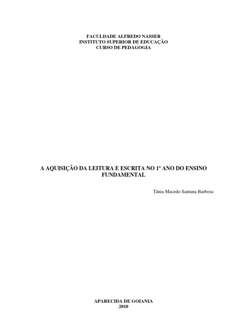 A AQUISIO DA LEITURA E ESCRITA NO 1 ANO DO ENSINO FUNDAMENTAL1 Tnia Macedo Santana Barbosa2