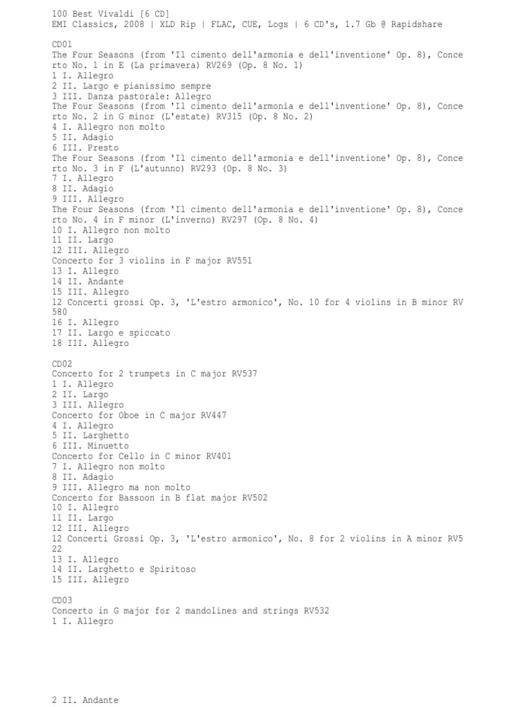 7 Gb @ Rapidshare CD01 The Four Seasons (from 'Il cimento dell'armonia e dell'inventione' rto No. 1 in E (La primavera) RV269 (Op. 8 No. 1) 1 I. Allegro 2 II. Largo e pianissimo sempre 3 III. Danza pastorale: Allegro The Four Seasons (from 'Il cimento dell'armonia e dell'inventione' rto No. 2 in G minor (L'estate) RV315 (Op. 8 No. 2) 4 I. Allegro non molto 5 II. Adagio 6 III. Presto The Four Seasons (from 'Il cimento dell'armonia e dell'inventione' rto No. 3 in F (L'autunno) RV293 (Op. 8 No. 3) 7 I. Allegro 8 II. Adagio 9 III. Allegro The Four Seasons (from 'Il cimento dell'armonia e dell'inventione' rto No. 4 in F minor (L'inverno) RV297 (Op. 8 No. 4) 10 I. Allegro non molto 11 II. Largo 12 III. Allegro Concerto for 3 violins in F major RV551 13 I. Allegro 14 II. Andante 15 III. Allegro 12 Concerti grossi Op. 3, 'L'estro armonico', No. 10 for 4 violins 580 16 I. Allegro 17 II. Largo e spiccato 18 III. Allegro Op. 8), Conce