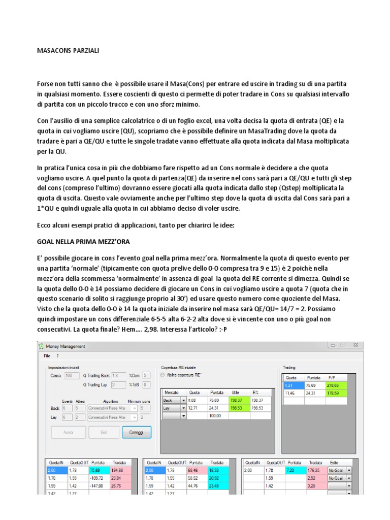 Forse non tutti sanno che possibile usare il Masa(Cons) per entrare ed uscire in trading su di una partita in qualsiasi momento. Essere coscienti di questo ci permette di poter tradare in Cons su qualsiasi intervallo di partita con un piccolo trucco e con uno sforz minimo. Con lausilio di una semplice calcolatrice o di un foglio excel, una volta decisa la quota di entrata (QE) e la quota in cui vogliamo uscire (QU), scopriamo che possibile definire un MasaTrading dove la quota da tradare pari a QE/QU e tutte le singole tradate vanno effettuate alla quota indicata dal Masa moltiplicata per la QU. In pratica lunica cosa in pi che dobbiamo fare rispetto ad un Cons normale decidere a che quota vogliamo uscire. A quel punto la quota di partenza(QE) da inserire nel cons sar pari a QE/QU e tutti gli step del cons (compreso lultimo) dovranno essere giocati alla quota indicata dallo step (Qstep) moltiplicata la quota di uscita. Questo vale ovviamente anche per lultimo step dove la quota di uscita dal Cons sar pari a 1*QU e quindi uguale alla quota in cui abbiamo deciso di voler uscire. Ecco alcuni esempi pratici di applicazioni, tanto per chiarirci le idee: GOAL NELLA PRIMA MEZZORA E possibile giocare in cons levento goal nella prima mezzora. Normalmente la quota di questo evento per una partita normale (tipicamente con quota prelive dello 0-0 compresa tra 9 e 15) 2 poich nella mezzora della scommessa normalmente in assenza di goal la quota del RE corrente si dimezza. Quindi se la quota dello 0-0 14 possiamo decidere di giocare un Cons in cui vogliamo uscire a quota 7 (quota che in questo scenario di solito si raggiunge proprio al 30) ed usare questo numero come quoziente del Masa. Visto che la quota dello 0-0 14 la quota iniziale da inserire nel masa sar QE/QU= 14/7 = 2. Possiamo quindi impostare un cons differenziale 6-5-5 alta 6-2-2 alta dove si vincente con uno o pi goal non consecutivi. La quota finale? Hem. 2,98. Interessa larticolo? :-P