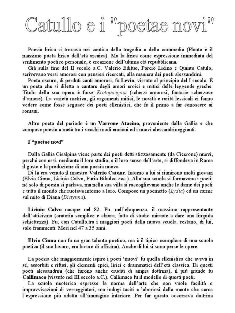 . Ma la lirica come espressione immediata del sentimento poetico personale, creazione dellultima et repubblicana. Gi sulla fine del II secolo a.C. Valerio Edituo, Porcio Licino e Quinto Catulo, scrivevano versi amorosi con pensieri ricercati, alla maniera dei poeti alessandrini. Poeta oscuro, di perduti canti amorosi, fu Levio, vissuto al principio del I secolo. un poeta che si diletta a cantare degli amori eroici e mitici delle leggende greche. Titolo della sua opera forse Erotopaegnia (scherzi amorosi, fantasie scherzose damore). La variet metrica, gli argomenti mitici, le novit e rarit lessicali ci fanno vedere come fosse seguace dei poeti ellenistici, che fu il primo a far conoscere ai romani. Altro poeta del periodo un Varrone Atacino, proveniente dalla Gallia e che compose poesia a met tra i vecchi modi enniani ed i nuovi alessandrineggianti. I poetae novi Dalla Gallia Cisalpina viene parte dei poeti detti stizzosamente (da Cicerone) nuovi, perch con essi, mediante il loro studio, e il loro senso dellarte, si diffondeva in Roma il gusto e la produzione di una poesia nuova. Di l era venuto il maestro Valerio Catone. Intorno a lui si riunirono molti giovani (Elvio Cinna, Licinio Calvo, Furio Bibulco ecc.). Alla sua scuola si formavano i poeti: n solo di poesia si parlava, ma nella sua villa si raccoglievano anche le dame dei poeti e tutto il mondo che ruotava intorno a loro. Compose un poemetto (Lydia) ed un carme sul mito di Diana (Dictynna). Licinio Calvo nacque nel 82. Fu, nelleloquenza, il massimo rappresentante dellatticismo (oratoria semplice e chiara, fatta di studio mirante a dare una limpida schiettezza). Fu, con Catullo,tra i maggiori poeti della nuova scuola. restano, di lui, solo frammenti. Mor nel 47 a 35 anni. Elvio Cinna non fu un gran talento poetico, ma il tipico esemplare di una scuola poetica (il suo lavoro, era lavoro di officina). Anche di lui si sono perse le opere. La poesia che maggiormente ispir i poeti nuovi fu quella ellenistica che aveva in s, assorbiti e rifusi, gli elementi epici, lirici e drammatici dellet classica. Di questi poeti alessandrini (che furono anche eruditi di ampia dottrina), il pi grande fu Callimaco (vissuto nel III secolo a.C.). Callimaco fu il modello di questi poeti. La scuola neoterica espresse la norma dellarte che non vuole facilit o improvvisazioni di verseggiatori, ma indugi taciti e laboriosi della mente che cerca lespressione pi adatta allimmagine interiore. Per far questo occorreva dottrina