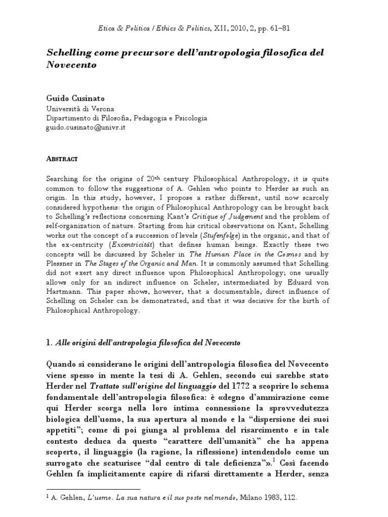 A. Harnack, Marcion: Das Evangelium vom fremden Gott, Leipzig 1921, II Auf. 1924. Cfr. P. Wust, Schelers Lehre vom Menschen, in: Das Neue Reich, XI, 1928-1929, 138. 9 Cfr. G. Cusinato, La Freiheitsschrift e gli inizi di una nuova filosofia della persona, in: F. Forlin/M. Dalla Valle, Lessenza della libert. Guida alla lettura delle Ricerche Filosofiche di F.W.J. Schelling, Milano-Udine 2010, 15-32.