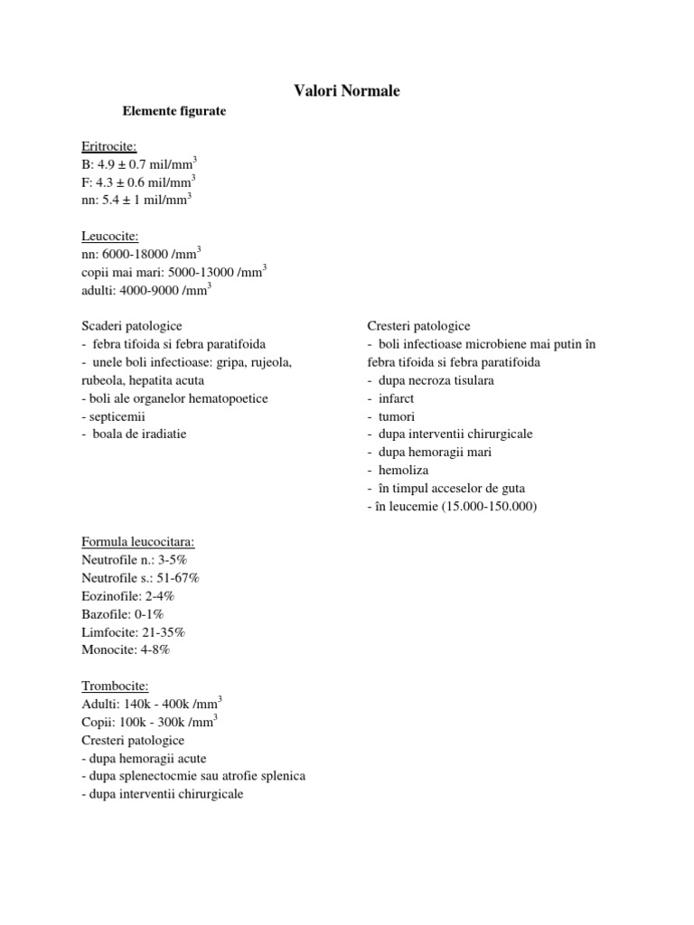 Formula leucocitara: Neutrofile n.: 3-5% Neutrofile s.: 51-67% Eozinofile: 2-4% Bazofile: 0-1% Limfocite: 21-35% Monocite: 4-8% Trombocite: Adulti: 140k - 400k /mm3 Copii: 100k - 300k /mm3 Cresteri patologice - dupa hemoragii acute - dupa splenectocmie sau atrofie splenica - dupa interventii chirurgicale