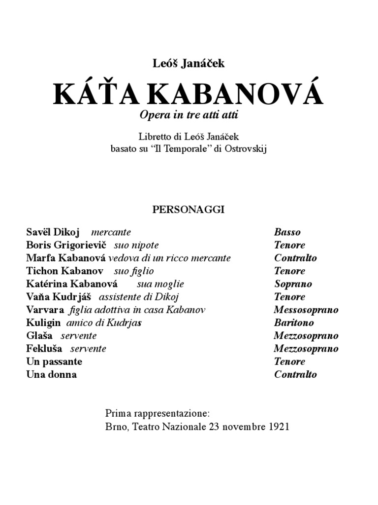 PERSONAGGI Savl Dikoj mercante Boris Grigorievi suo nipote Marfa Kabanov vedova di un ricco mercante Tichon Kabanov suo glio Katrina Kabanov sua moglie Vaa Kudrj assistente di Dikoj Varvara glia adottiva in casa Kabanov Kuligin amico di Kudrjas Glaa servente Feklua servente Un passante Una donna Basso Tenore Contralto Tenore Soprano Tenore Messosoprano Baritono Mezzosoprano Mezzosoprano Tenore Contralto