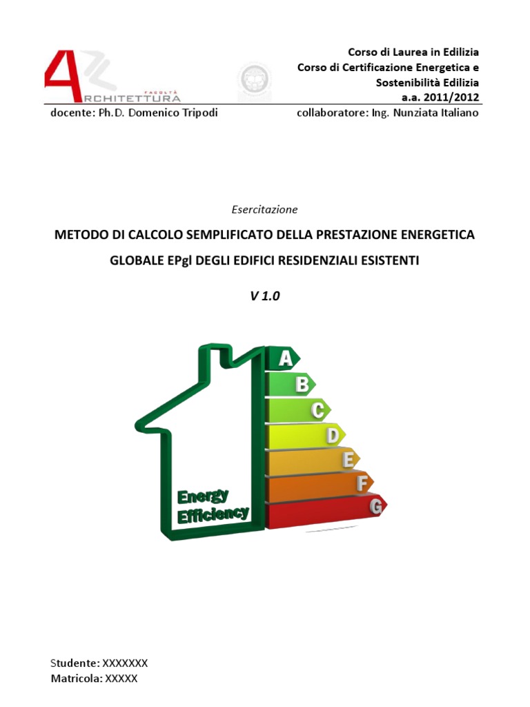 Dato un edificio residenziale esistente con superficie utile fino a 1000 m 2; noti i principali dati climatici, tipologici, geometrici ed impiantistici, calcolare: