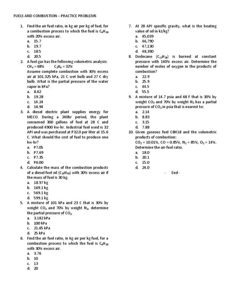 . Find the air fuel ratio, in kg air per kg of fuel, for a combustion process to which the fuel is C8H20 with 20% excess air. a. 15.7 b. 19.7 c. 18.5 d. 20.5 2. A fuel gas has the following volumetric analysis: CH4 = 68% C2H6 = 32% Assume complete combustion with 30% excess air at 101.325 kPa, 21 C wet bulb and 27 C dry bulb. What is the partial pressure of the water vapor in kPa? a. 8.62 b. 19.28 c. 14.24 d. 16.94 3. A diesel electric plant supplies energy for MECO. During a 240hr period, the plant consumed 300 gallons of fuel at 28 C and produced 4900 kw-hr. Industrial fuel used is 32 API and was purchased at P32.0 per liter at 15.6 C. What should the cost of fuel to produce one kw-hr? a. P7.05 b. P7.69 c. P7.35 d. P6.00 4. Calculate the mass of the combustion products of a diesel fuel oil (C16H30) with 30% excess air if the mass of fuel is 30 kg. a. 18.97 kg b. 169.1 kg c. 569.1 kg d. 599.1 kg 5. A mixture of 101 kPa and 23 C that is 30% by weight CO2 and 70% by weight N2, determine the partial pressure of CO2. a. 3.182 kPa b. 100 kPa c. 21.65 kPa d. 25 kPa 6. Find the air fuel ratio, in kg air per kg fuel, for a combustion process to which the fuel is C8H20 with 30% excess air. a. 3.76 b. 10 c. 13 d. 20 7. At 28 API specific gravity, what is the heating value of oil in kJ/kg? a. 45,039 b. 46,790 c. 47,130 d. 48,390 8. Dodecane (C12H26) is burned at constant pressure with 140% excess air. Determine the number of moles of oxygen in the products of combustion? a. 22.9 b. 25.9 c. 44.5 d. 55.5 9. A mixture of 14.7 psia and 68 F that is 30% by weight CO2 and 70% by weight N2 has a partial pressure of CO2 in psia that is nearest to: a. 2.14 b. 8.83 c. 3.15 d. 7.88 10. Given gaseous fuel C8H18 and the volumetric products of combustion: CO2 = 10.01%, CO = 0.85%, N2 = 85%, O2 = 14%. Determine the air-fuel ratio. a. 18.0 b. 20.1 c. 15.0 d. 24.0 - End -