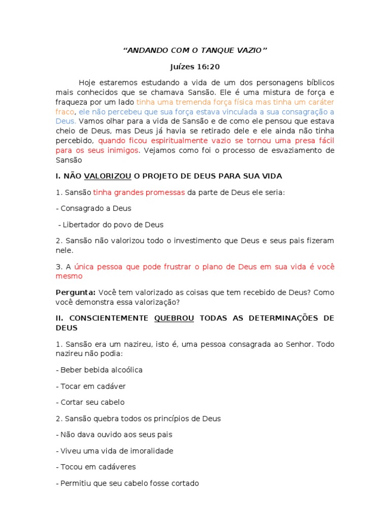 que se chamava Sanso. Ele uma mistura de fora e fraqueza por um lado tinha uma tremenda fora fsica mas tinha um carter fraco, ele no percebeu que sua fora estava vinculada a sua consagrao a Deus. Vamos olhar para a vida de Sanso e de como ele pensou que estava cheio de Deus, mas Deus j havia se retirado dele e ele ainda no tinha percebido, quando ficou espiritualmente vazio se tornou uma presa fcil para os seus inimigos. Vejamos como foi o processo de esvaziamento de Sanso I. NO VALORIZOU O PROJETO DE DEUS PARA SUA VIDA 1. Sanso tinha grandes promessas da parte de Deus ele seria: - Consagrado a Deus - Libertador do povo de Deus 2. Sanso no valorizou todo o investimento que Deus e seus pais fizeram nele. 3. A nica pessoa que pode frustrar o plano de Deus em sua vida voc mesmo Pergunta: Voc tem valorizado as coisas que tem recebido de Deus? Como voc demonstra essa valorizao? II. CONSCIENTEMENTE QUEBROU TODAS AS DETERMINAES DE DEUS 1. Sanso era um nazireu, isto , uma pessoa consagrada ao Senhor. Todo nazireu no podia: - Beber bebida alcolica - Tocar em cadver - Cortar seu cabelo 2. Sanso quebra todos os princpios de Deus - No dava ouvido aos seus pais - Viveu uma vida de imoralidade - Tocou em cadveres - Permitiu que seu cabelo fosse cortado
