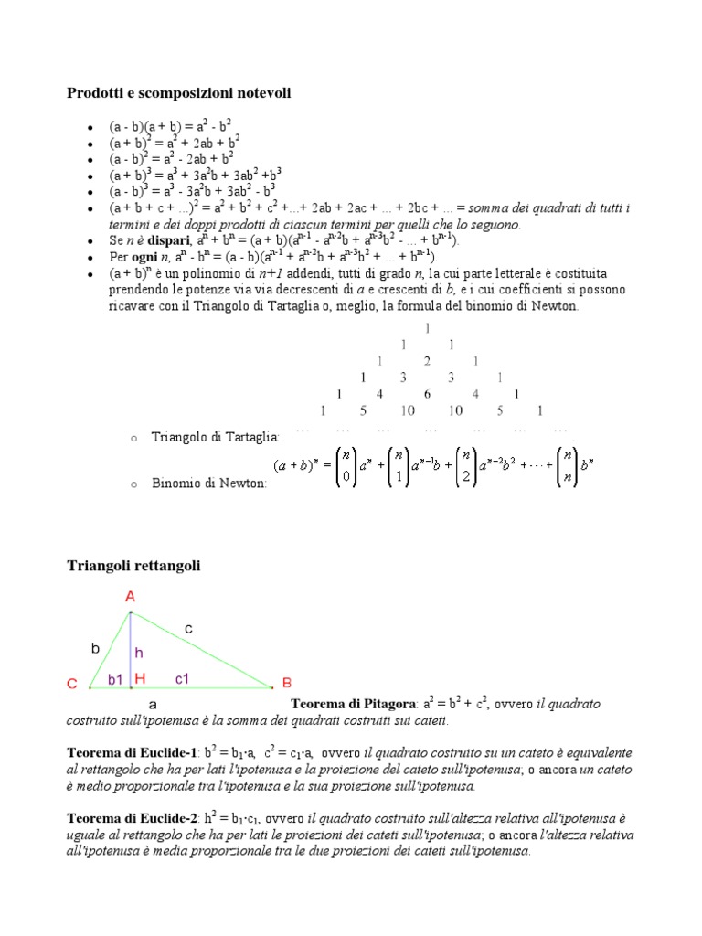 (a - b)(a + b) = a2 - b2 (a + b)2 = a2 + 2ab + b2 (a - b)2 = a2 - 2ab + b2 (a + b)3 = a3 + 3a2b + 3ab2 +b3 (a - b)3 = a3 - 3a2b + 3ab2 - b3 (a + b + c + ...)2 = a2 + b2 + c2 +...+ 2ab + 2ac + ... + 2bc + ... = somma dei quadrati di tutti i termini e dei doppi prodotti di ciascun termini per quelli che lo seguono. Se n dispari, an + bn = (a + b)(an-1 - an-2b + an-3b2 - ... + bn-1). Per ogni n, an - bn = (a - b)(an-1 + an-2b + an-3b2 + ... + bn-1). (a + b)n un polinomio di n+1 addendi, tutti di grado n, la cui parte letterale costituita prendendo le potenze via via decrescenti di a e crescenti di b, e i cui coefficienti si possono ricavare con il Triangolo di Tartaglia o, meglio, la formula del binomio di Newton.