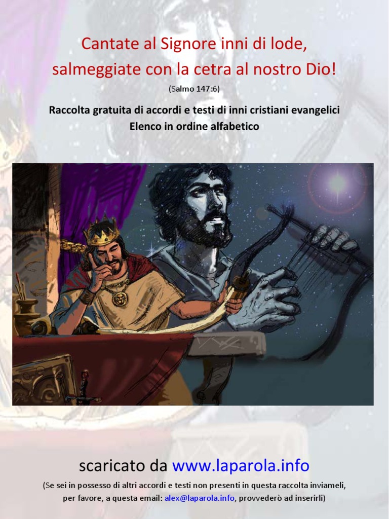 A A Chi grider? A chi ti rivolgi A colui che vince A Dio sia la gloria A Dio sia la gloria (Inno 19) A Lui che siede sul tron A Pentecoste (Inno 90) A Te A Te mi rivolgo A Te rivolgo la mia preghiera Abba Padre Abba Padre degno il Tuo nome Abbi fiducia (Inno 632) Abbiam trovato in Ges (Inno 550) Acclamate il Signor Adorerai (Inno 561) Adoreremo Adoreremo alla rpesenza Tua Adorer Adorer con tutto il mio cuor Adoriamo il Re di gloria Adoro adorarti Adoro Te Adoro Te Ges Affidarsi a Ges (Inno 500) Agnus Dei Ah Signor Ai piedi del Tuo gran trono Ai piedi della croce Aiutaci Signor Al di l del sol (Inno 426) Al Golgota! (Inno 285)