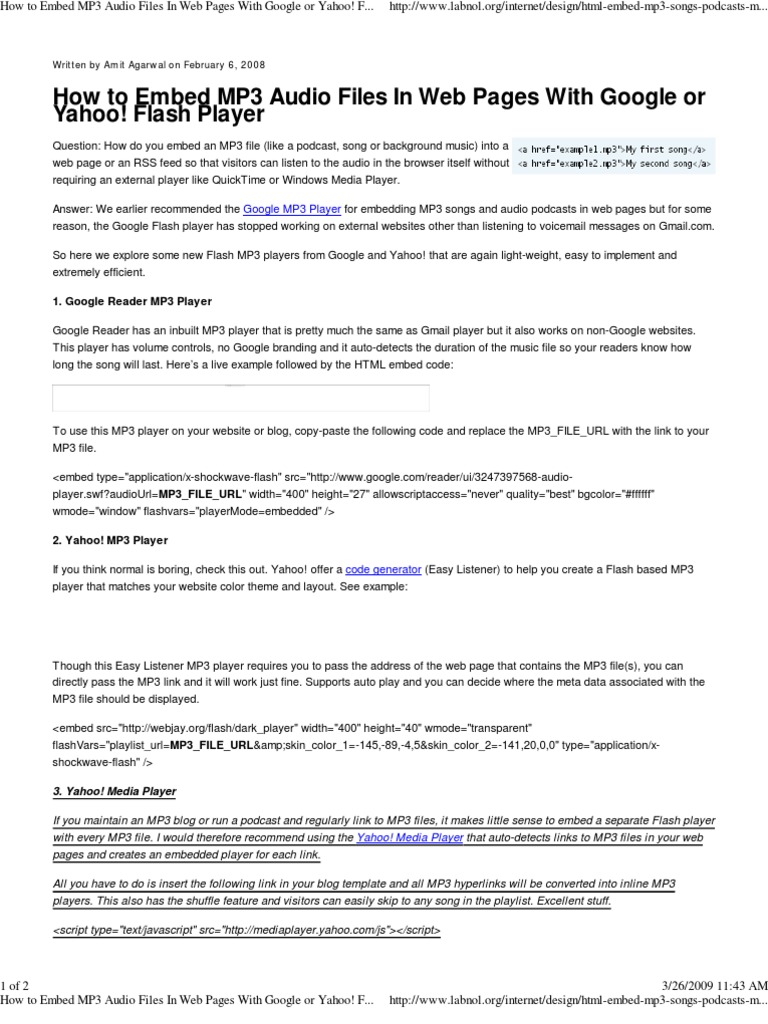 How to Embed MP3 Audio Files In Web Pages With Google or Yahoo! F... http://www.labnol.org/internet/design/html-embed-mp3-songs-podcasts-m...