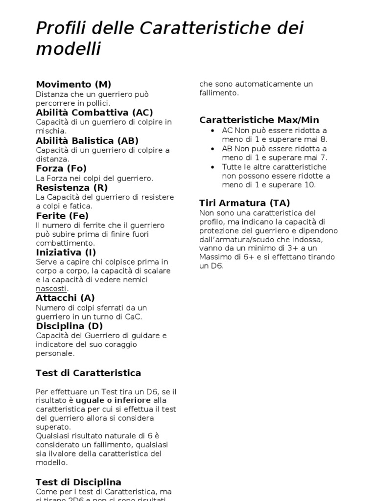 Mazze, Asce, Spade e Altre armi Ascia di Gromril, Spada di Ithilmar e Lama del Pianto si considerano Asce e Spade ai fini della regola Agile Arco Lungo, Corto, Elfico si considerano tutti Archi al fine delle abilit di Tiro Pistola da Duello e Pistola a Warpietra sono comunque pistole ai fini delle abilit di Tiro. Ferite Critiche Se tiri un 6 naturale quando tiri per ferire, hai inflitto una ferita critica, ferite critiche infliggono due ferite al bersaglio 4. Il Bersaglio effettua i normali Tiri Armatura, ma tira separatamente per ogni ferita. 5. Se NECESSARIO che lattaccante ottenga un 6 naturale per ferire il bersaglio, egli NON pu effettuare un critico nei suoi confronti. 6. Se il Bersaglio ha meno ferite rimanenti di quelle subite tira un D6 per ogni ferita in eccesso e tieni il risultato pi alto, questo considerato un infortunio. Massacro Se un Guerriero ferito da un attacco che normalmente lo ferirebbe automaticamente (la forza di chi attacca il doppio o pi della resistenza del bersaglio),tutti i tiri per infortuni che scaturiscono da questa ferita hanno un bonus di +1 4. Le ferite Automatiche non provocano mai critici. 5. In ogni caso puoi decidere di non ferire automaticamente ma di ferire al 2+ ottenendo la possibilit di fare critico e mantenendo anche il bonus di +1 ai tiri per gli infortuni. 6. Se fai Critico in questo caso il bonus di +1 agli infortuni si applica a tutti i tiri fatti. Agile Se un personaggio equipaggia uno Scudo e una Spada, Ascia, Mazza (o anche Daga o Lancia Pesante, ma solo in CaC in ogni caso per queste