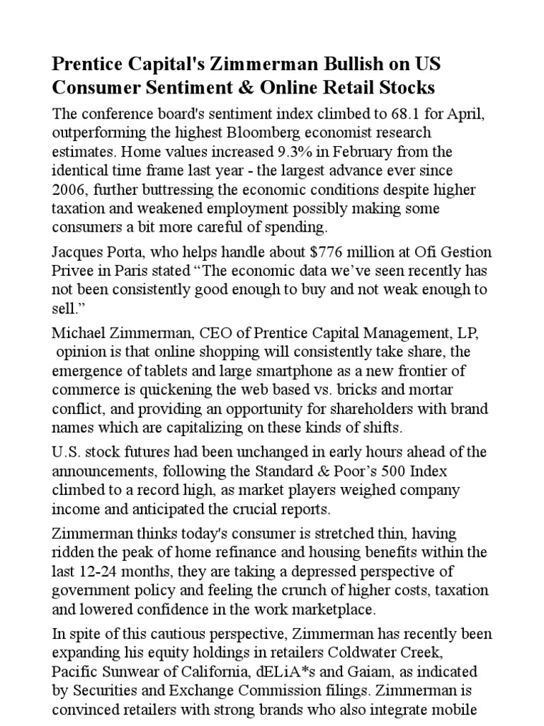 The conference board's sentiment index climbed to 68.1 for April, outperforming the highest Bloomberg economist research estimates. Home values increased 9.3% in February from the identical time frame last year - the largest advance ever since 2006, further buttressing the economic conditions despite higher taxation and weakened employment possibly making some consumers a bit more careful of spending. Jacques Porta, who helps handle about $776 million at Ofi Gestion Privee in Paris stated The economic data weve seen recently has not been consistently good enough to buy and not weak enough to sell. Michael Zimmerman, CEO of Prentice Capital Management, LP, opinion is that online shopping will consistently take share, the emergence of tablets and large smartphone as a new frontier of commerce is quickening the web based vs. bricks and mortar conflict, and providing an opportunity for shareholders with brand names which are capitalizing on these kinds of shifts. U.S. stock futures had been unchanged in early hours ahead of the announcements, following the Standard & Poors 500 Index climbed to a record high, as market players weighed company income and anticipated the crucial reports. Zimmerman thinks today's consumer is stretched thin, having ridden the peak of home refinance and housing benefits within the last 12-24 months, they are taking a depressed perspective of government policy and feeling the crunch of higher costs, taxation and lowered confidence in the work marketplace. In spite of this cautious perspective, Zimmerman has recently been expanding his equity holdings in retailers Coldwater Creek, Pacific Sunwear of California, dELiA*s and Gaiam, as indicated by Securities and Exchange Commission filings. Zimmerman is convinced retailers with strong brands who also integrate mobile