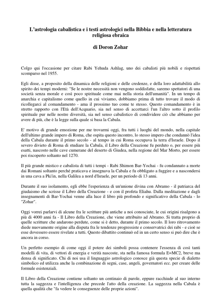 Colgo qui l'occasione per citare Rabi Yehuda Ashlag, uno dei cabalisti pi nobili e rispettati scomparso nel 1955. Egli disse, a proposito della dinamica delle religioni e delle credenze, e della loro adattabilit allo spirito dei tempi moderni: "Se le nostre necessit non vengono soddisfatte, saremo spettatori di una societ senza morale e cos poco spirituale come mai nella storia dell'umanit". In un tempo di anarchia e capitalismo come quello in cui viviamo, dobbiamo prima di tutto trovare il modo di ricollegarci al comandamento - ama il prossimo tuo come te stesso. Questo comandamento in stretto rapporto con l'Et dell'Acquario, sia nel senso di accettarci l'un l'altro sotto il profilo spirituale pur nelle nostre diversit, sia nel senso cabalistico di condividere ci che abbiamo per avere di pi, che la legge sulla quale si basa la Cabala. E' motivo di grande emozione per me trovarmi oggi, fra tutti i luoghi del mondo, nella capitale dell'ultimo grande impero di Roma, che ospita questo incontro, lo stesso impero che condann l'idea della Cabala durante il primo secolo - al tempo in cui Roma occupava la terra d'Israele. Dopo il severo divieto di Roma di studiare la Cabala, il Libro della Creazione fu perduto o, per essere pi esatti, nascosto nelle cave cumerane del deserto di Giudea, nella regione del Mar Morto, per essere poi riscoperto soltanto nel 1270. Il pi grande mistico e cabalista di tutti i tempi - Rabi Shimon Bar-Yochai - fu condannato a morte dai Romani soltanto perch praticava e insegnava la Cabala e fu obbligato a fuggire e a nascondersi in una cava a Pki'in, nella Galilea a nord d'Israele, per un periodo di 13 anni. Durante il suo isolamento, egli ebbe l'esperienza di un'unione divina con Abramo - il patriarca del giudaismo che scrisse il Libro della Creazione - e con il profeta Eliahu. Dalla meditazione e dagli insegnamenti di Bar-Yochai venne alla luce il libro pi profondo e significativo della Cabala - lo "Zohar". Oggi vorrei parlarvi di alcune fra le scritture pi antiche a noi conosciute, le cui origini risalgono a pi di 4000 anni fa - Il Libro della Creazione, che viene attribuito ad Abramo. Si tratta proprio di quelle scritture che andarono perdute, come si detto, durante il primo secolo. Il loro ritrovamento diede nuovamente origine alla disputa fra le tendenze progressiste e conservatrici dei rabi - e cio se esse dovessero essere rivelate a tutti. Questo dibattito continu ed in un certo senso si pu dire che ancora in corso. Un perfetto esempio di come oggi il potere dei simboli possa contenere l'essenza di cos tanti modelli di vita, di vettori di energia e verit nascoste, sta nella famosa formula E=MC2, breve ma densa di significato. Chi di noi usa il linguaggio astrologico conosce gi questa specie di dialetto simbolico ed utilizza anche la combinazione di segni, case, angeli, governatori ecc. per creare delle formule esistenziali. Il Libro della Creazione contiene soltanto un centinaio di parole, eppure racchiude al suo interno tutta la saggezza e l'intelligenza che precede l'atto della creazione. La saggezza nella Cabala quella qualit che "fa vedere le conseguenze delle proprie azioni".