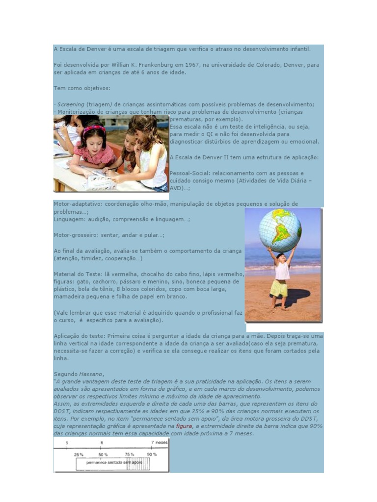 . Frankenburg em 1967, na universidade de Colorado, Denver, para ser aplicada em crianas de at 6 anos de idade. Tem como objetivos: Screening (triagem) de crianas assintomticas com possveis problemas de desenvolvimento; Monitorizao de crianas que tenham risco para problemas de desenvolvimento (crianas prematuras, por exemplo). Essa escala no um teste de inteligncia, ou seja, para medir o QI e no foi desenvolvida para diagnosticar distrbios de aprendizagem ou emocional. A Escala de Denver II tem uma estrutura de aplicao: Pessoal-Social: relacionamento com as pessoas e cuidado consigo mesmo (Atividades de Vida Diria AVD); Motor-adaptativo: coordenao olho-mo, manipulao de objetos pequenos e soluo de problemas; Linguagem: audio, compreenso e linguagem; Motor-grosseiro: sentar, andar e pular; Ao final da avaliao, avalia-se tambm o comportamento da criana (ateno, timidez, cooperao) Material do Teste: l vermelha, chocalho do cabo fino, lpis vermelho, figuras: gato, cachorro, pssaro e menino, sino, boneca pequena de plstico, bola de tnis, 8 blocos coloridos, copo com boca larga, mamadeira pequena e folha de papel em branco. (Vale lembrar que esse material adquirido quando o profissional faz o curso, especfico para a avaliao). Aplicao do teste: Primeira coisa perguntar a idade da criana para a me. Depois traa-se uma linha vertical na idade correspondente a idade da criana a ser avaliada(caso ela seja prematura, necessita-se fazer a correo) e verifica se ela consegue realizar os itens que foram cortados pela linha. Segundo Hassano, A grande vantagem deste teste de triagem a sua praticidade na aplicao. Os itens a serem avaliados so apresentados em forma de grfico, e em cada marco do desenvolvimento, podemos observar os respectivos limites mnimo e mximo da idade de aparecimento. Assim, as extremidades esquerda e direita de cada uma das barras, que representam os itens do DDST, indicam respectivamente as idades em que 25% e 90% das crianas normais executam os itens. Por exemplo, no item permanece sentado sem apoio, da rea motora grosseira do DDST, cuja representao grfica apresentada na figura, a extremidade direita da barra indica que 90% das crianas normais tem essa capacidade com idade prxima a 7 meses.
