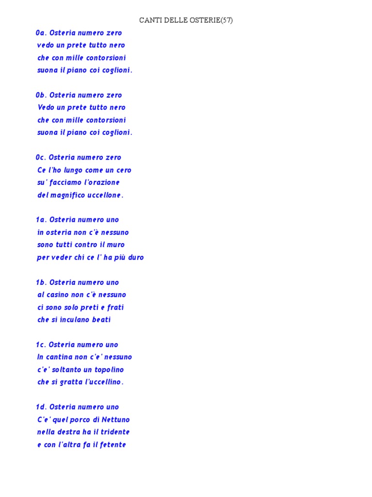 Osteria numero zero vedo un prete tutto nero che con mille contorsioni suona il piano coi coglioni. 0b. Osteria numero zero Vedo un prete tutto nero che con mille contorsioni suona il piano coi coglioni. 0c. Osteria numero zero Ce l'ho lungo come un cero su' facciamo l'orazione del magnifico uccellone. 1a. Osteria numero uno in osteria non c' nessuno sono tutti contro il muro per veder chi ce l' ha pi duro 1b. Osteria numero uno al casino non c' nessuno ci sono solo preti e frati che si inculano beati 1c. Osteria numero uno In cantina non c'e' nessuno c'e' soltanto un topolino che si gratta l'uccellino. 1d. Osteria numero uno C'e' quel porco di Nettuno nella destra ha il tridente e con l'altra fa il fetente