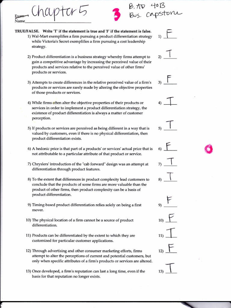 TRUE/FALSE. Write'T'if the statement is true and'F'if the statement is false. 1) Wal-Mart exemplifies a firm pursuing a product differentiation strategy while Victoria's Secret exemplifies a firm pursuing a cost leadership