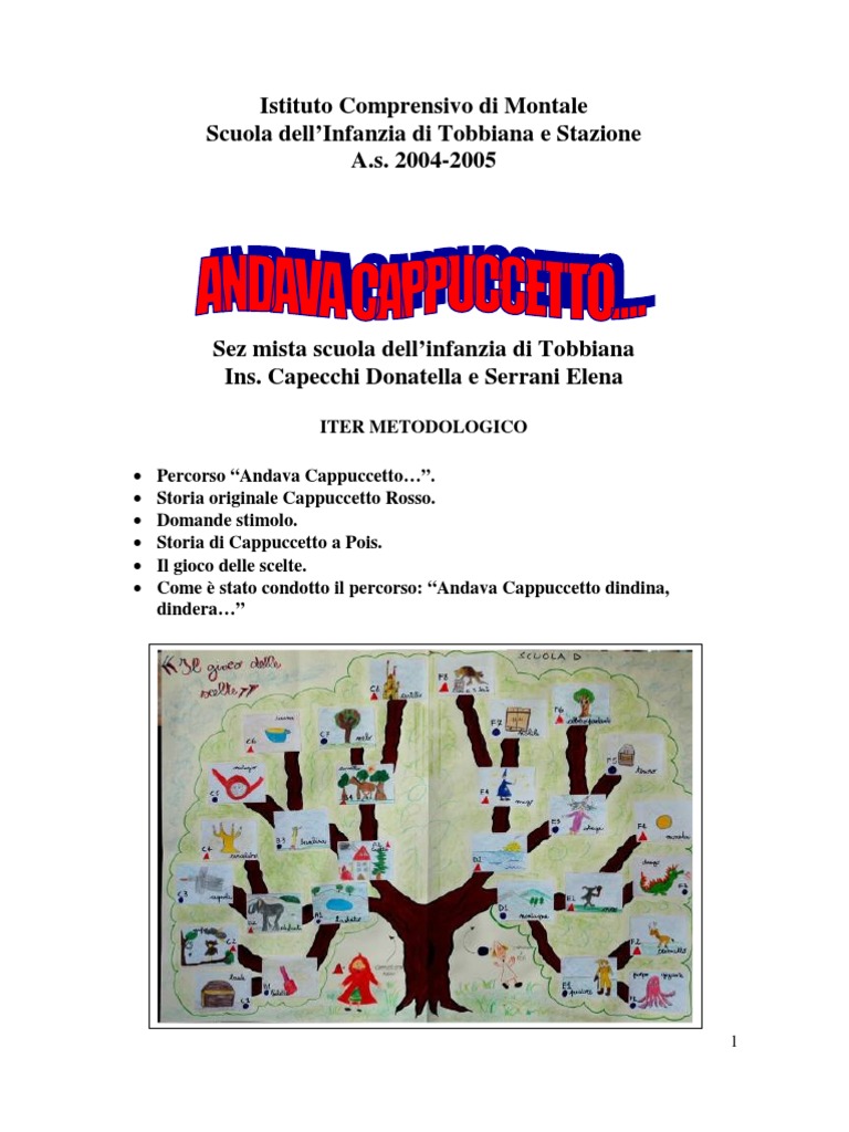 giochi vari con i blocchi logici; ecc Con i bambini abbiamo inventato un gioco, su suggerimento del professore Piochi, e lo abbiamo chiamato IL GIOCO DELLE SCELTE. Lo abbiamo rappresentato come un grande albero ( una sorta di DIAGRAMMA AD ALBERO ) dove alla base ci sono i 2 personaggi principali ( Cappuccetto Rosso e Cappuccetto a Pois ). Al di sopra sincontrano AMBIENTI, COSE e PERSONAGGI utili per costruire una storia ( vedi ISTRUZIONI PER LUSO allegate al gioco ). N.B.: i vari elementi per la costruzione del Diagramma sono stati scelti assieme ai bambini, che li hanno anche disegnati per il grande cartellone da gioco. FASE I : Canzone e fiaba CAPPUCCETTO ROSSO Andava Cappuccetto dindina dindera/dindina dind tra lerba, tra i fiori di mille colori allegra e spensierata il sentiero imbuc. Ma venne un lupo nero dindina dindera/dindina dind le disse Sei bella, hai gli occhi di stella e Cappuccetto Rosso con lui si ferm. Andiamo dalla nonna dindina dindera/dindina dind ad un buon boccone pensava il briccone e il lupo a passi svelti per primo arriv. Toc, toc son Cappuccetto dindina dindera/dindina dind tira il paletto, su entra ti aspetto e il lupo in un boccone la nonna mangi. Con cuffia e camicione dindina dindera/dindina dind rideva, cantava e il lupo aspettava e quando ud bussare Avanti! grid. Che mani, che spavento dindina dindera/dindina dind nonnina mi senti, perch hai lunghi denti e il lupo in un boccone la bimba mangi. Ma un bravo cacciatore dindina dindera/dindina dind spara e fa BUMM! In pancia del lupo e nonna e Cappuccetto cos liber! Testo della fiaba raccontata ai bambini ( 2v ) ( 2v ) ( 2v ) ( 2v ) ( 2v ) ( 2v ) ( 2v )