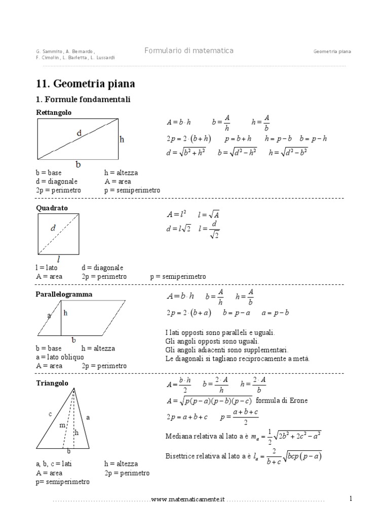 b = base d = diagonale 2p = perimetro Quadrato h = altezza A = area p = semiperimetro