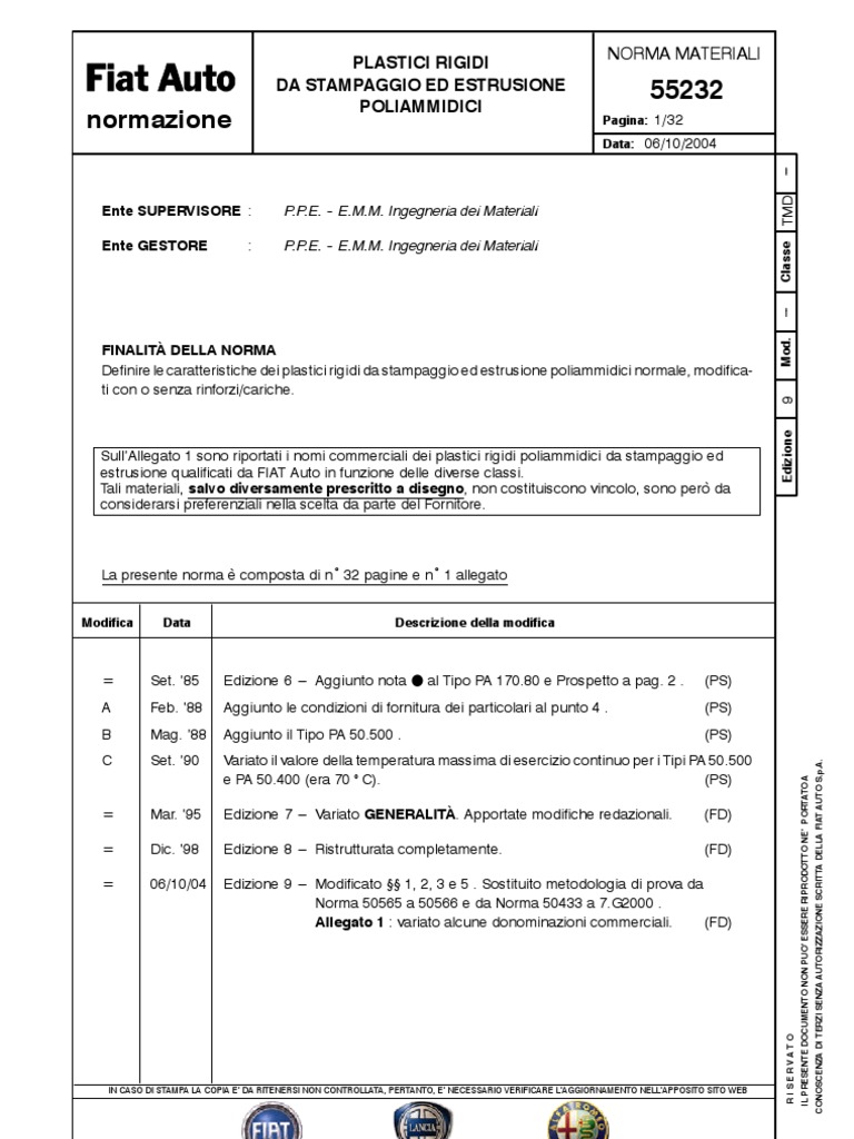 SullAllegato 1 sono riportati i nomi commerciali dei plastici rigidi poliammidici da stampaggio ed estrusione qualificati da FIAT Auto in funzione delle diverse classi. Tali materiali, salvo diversamente prescritto a disegno, non costituiscono vincolo, sono per da considerarsi preferenziali nella scelta da parte del Fornitore.