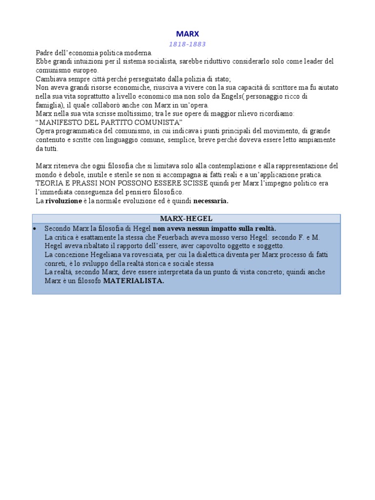 1818-1883 Padre delleconomia politica moderna. Ebbe grandi intuizioni per il sistema socialista, sarebbe riduttivo considerarlo solo come leader del comunismo europeo. Cambiava sempre citt perch perseguitato dalla polizia di stato; Non aveva grandi risorse economiche, riusciva a vivere con la sua capacit di scrittore ma fu aiutato nella sua vita soprattutto a livello economico ma non solo da Engels( personaggio ricco di famiglia), il quale collabor anche con Marx in unopera. Marx nella sua vita scrisse moltissimo; tra le sue opere di maggior rilievo ricordiamo: MANIFESTO DEL PARTITO COMUNISTA Opera programmatica del comunismo, in cui indicava i punti principali del movimento, di grande contenuto e scritte con linguaggio comune, semplice, breve perch doveva essere letto ampiamente da tutti. Marx riteneva che ogni filosofia che si limitava solo alla contemplazione e alla rappresentazione del mondo debole, inutile e sterile se non si accompagna ai fatti reali e a unapplicazione pratica. TEORIA E PRASSI NON POSSONO ESSERE SCISSE quindi per Marx limpegno politico era limmediata conseguenza del pensiero filosofico. La rivoluzione la normale evoluzione ed quindi necessaria. MARX-HEGEL Secondo Marx la filosofia di Hegel non aveva nessun impatto sulla realt. La critica esattamente la stessa che Feuerbach aveva mosso verso Hegel: secondo F. e M. Hegel aveva ribaltato il rapporto dellessere, aver capovolto oggetto e soggetto. La concezione Hegeliana va rovesciata, per cui la dialettica diventa per Marx processo di fatti conreti, lo sviluppo della realt storica e sociale stessa La realt, secondo Marx, deve essere interpretata da un punto di vista concreto; quindi anche Marx un filosofo MATERIALISTA.