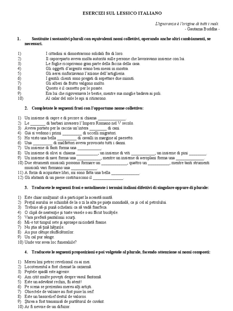 L'ignoranza l'origine di tutti i mali. - Gautama Buddha 1. 1) 2) 3) 4) 5) 6) 7) 8) 9) 10) Sostituite i sostantivi plurali con equivalenti nomi collettivi, operando anche altri cambiamenti, se necessari. I cittadini si dimostrarono solidali fra di loro. Il caporeparto aveva molta autorit sulle persone che lavoravano insieme con lui. Le foglie ricoprivano gran parte della faccia della casa. Gli oggetti dargento erano ben messi in mostra. Gli aerei rinforzavano lazione dellartiglieria. I gentili clienti sono pregati di aspettare due minuti. Gli alberi da frutto valgono molto. Questo il cassetto per le posate. Era lui che rigovernava le bestie, mentre sua moglie badava ai poli. Al calar del sole le api si ritirarono. 2. Completate le seguenti frasi con lopportuno nome collettivo: 1) 2) 3) 4) 5) 6) 7) 8) 9) 10) Un insieme di capre e di pecore si chiama _____________. Le _______ di barbari invasero lImpero Romano nel V secolo. Aveva portato per la caccia unintera ________ di cani. Gi si vedono i primi _________ di uccelli migratori. Ho visto una bella _________ di cavalli in margine al paesetto. Una _________ di malfattori aveva provocato tutti i danni. Un insieme di fanti forma una ___________. Un insieme di olivi si chiama __________, un insieme di viti ___________, un insieme di pini ________. Un insieme di navi forma una ___________, mentre un insieme di aeroplani forma una _____________. Due strumenti musicali possono formare un ____________, quattro un __________, mentre tanti strumenti musicali vari formano una ____________. 11) A forza di acquistare libri, mi sono fatta una bella _____________. 12) Gli abitanti di un paese costituiscono il ______________. 3. Traducete le seguenti frasi e sottolineate i termini italiani difettivi di singolare oppure di plurale: 1) 2) 3) 4) 5) 6) 7) 8) 9) 10) Este chiar mulumit c a participat la aceast nunt. Preul aurului se schimb de la o zi la alta pe piaa mondial, ca i cel al petrolului. Trebuie s-i pun ochelarii ca s vad foarfeca. O clip de neatenie i toate vasele s-au fcut bucele. Vara prefer pantalonii scuri. Mi-e tot timpul sete i aproape niciodat foame. Nu tia s in hurile. Au pus ctue rufctorilor. Un cal pur snge. Unde vor avea loc funeraliile? 4. Traducete le seguenti proposizioni e poi volgetele al plurale, facendo attenzione ai nomi composti: 1) 2) 3) 4) 5) 6) 7) 8) 9) 10) Mereu mi petrec revelionul cu ai mei. Locotenentul a fost chemat la cazarm. Petele spad este agresiv. Am citit multe poveti despre vasul fantom. Este un adevrat rechin, fii atent! Pe scena se prezentau mereu ali artiti. Obiectele de valoare au fost puse n seif. Este un basorelief destul de valoros. tirea a fost transmis de purttorul de cuvnt. Ar fi nevoie de un difuzor.