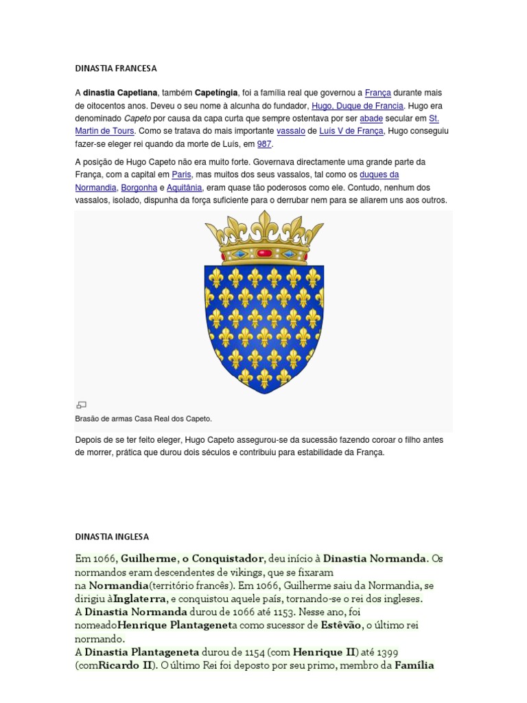 Em 1066, Guilherme, o Conquistador, deu incio Dinastia Normanda. Os normandos eram descendentes de vikings, que se fixaram na Normandia(territrio francs). Em 1066, Guilherme saiu da Normandia, se dirigiu Inglaterra, e conquistou aquele pas, tornando-se o rei dos ingleses. A Dinastia Normanda durou de 1066 at 1153. Nesse ano, foi nomeadoHenrique Plantageneta como sucessor de Estvo, o ltimo rei normando. A Dinastia Plantageneta durou de 1154 (com Henrique II) at 1399 (comRicardo II). O ltimo Rei foi deposto por seu primo, membro da Famlia