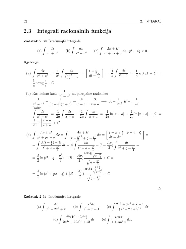 1 na parcijalne razlomke: a2 1 A B 1 1 1 = = + = A = , B = 2 2 x a (x a)(x + a) xa x+a 2a 2a Dakle, dx dx dx 1 1 1 1 = = ln |x a| ln |x + a| + C = 2 2 x a 2a xa 2a x+a 2a 2a x a 1 +C ln 2a x + a p Ax + B Ax + B x=t p t= x+ 2 2 = dx = dx = (c) 2 p2 dt = dx x2 + px + q x+ p + q 4 2 p A(t 2 )+B tdt Ap dt = dt = A + ( b ) 2 2 2 = 2 t2 + q p4 t2 + q p4 t2 + q p4 arctg q t p2 2 q 4 A p Ap = ln (t2 + q ) + (B ) +C = 2 2 4 2 q p4 x2 arctg q 2p2 q 4 Ap A +C ) = ln (x2 + px + q ) + (B 2 2 2 q p4