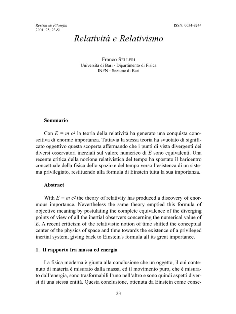 Sommario Con E = m c2 la teoria della relativit ha generato una conquista conoscitiva di enorme importanza. Tuttavia la stessa teoria ha svuotato di significato oggettivo questa scoperta affermando che i punti di vista divergenti dei diversi osservatori inerziali sul valore numerico di E sono equivalenti. Una recente critica della nozione relativistica del tempo ha spostato il baricentro concettuale della fisica dello spazio e del tempo verso lesistenza di un sistema privilegiato, restituendo alla formula di Einstein tutta la sua importanza. Abstract With E = m c2 the theory of relativity has produced a discovery of enormous importance. Nevertheless the same theory emptied this formula of objective meaning by postulating the complete equivalence of the diverging points of view of all the inertial observers concerning the numerical value of E. A recent criticism of the relativistic notion of time shifted the conceptual center of the physics of space and time towards the existence of a privileged inertial system, giving back to Einstein's formula all its great importance. 1. Il rapporto fra massa ed energia La fisica moderna giunta alla conclusione che un oggetto, il cui contenuto di materia misurato dalla massa, ed il movimento puro, che misurato dallenergia, sono trasformabili luno nellaltro e sono quindi aspetti diversi di una stessa entit. Questa conclusione, ottenuta da Einstein come conse23