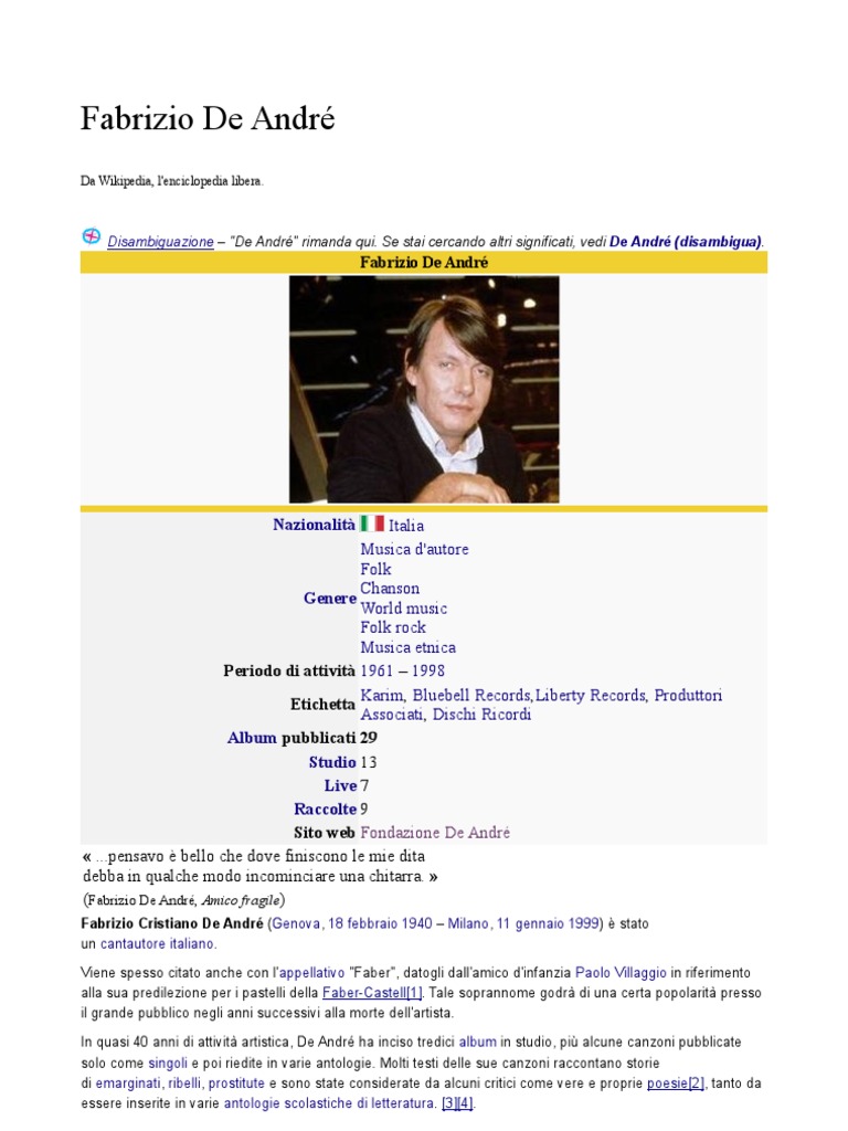 Italia Musica d'autore Folk Chanson Genere World music Folk rock Musica etnica Periodo di attivit 1961 1998 Karim, Bluebell Records,Liberty Records, Produttori Etichetta Associati, Dischi Ricordi Album pubblicati 29 Studio 13 Live 7 Raccolte 9 Sito web Fondazione De Andr ...pensavo bello che dove finiscono le mie dita debba in qualche modo incominciare una chitarra. (Fabrizio De Andr, Amico fragile)