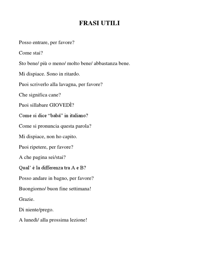 Posso entrare, per favore? Come stai? Sto bene/ pi o meno/ molto bene/ abbastanza bene. Mi dispiace. Sono in ritardo. Puoi scriverlo alla lavagna, per favore? Che significa cane? Puoi sillabare GIOVED? Come si dice bab in italiano? Come si pronuncia questa parola? Mi dispiace, non ho capito. Puoi ripetere, per favore? A che pagina sei/stai? Qual la differenza tra A e B? Posso andare in bagno, per favore? Buongiorno/ buon fine settimana! Grazie. Di niente/prego. A luned/ alla prossima lezione!