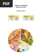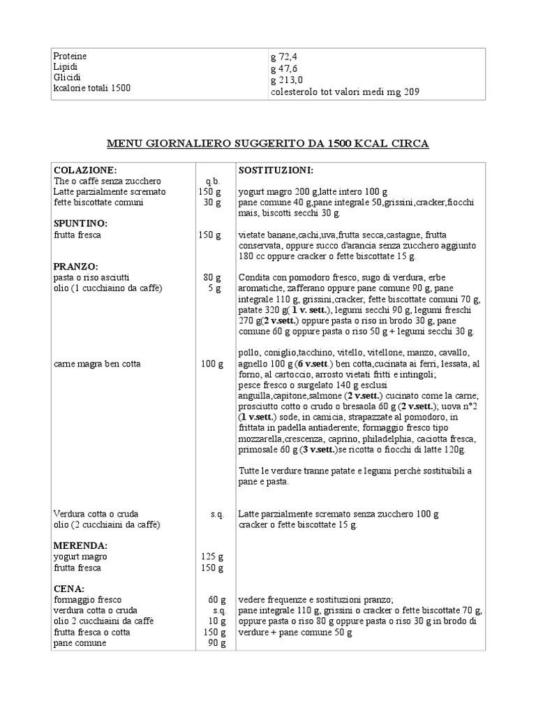 COLAZIONE: The o caff senza zucchero Latte parzialmente scremato fette biscottate comuni SPUNTINO: frutta fresca PRANZO: pasta o riso asciutti olio (1 cucchiaino da caff) SOSTITUZIONI: q.b. 150 g 30 g 150 g yogurt magro 200 g,latte intero 100 g pane comune 40 g,pane integrale 50,grissini,cracker,fiocchi mais, biscotti secchi 30 g. vietate banane,cachi,uva,frutta secca,castagne, frutta conservata, oppure succo d'arancia senza zucchero aggiunto 180 cc oppure cracker o fette biscottate 15 g. Condita con pomodoro fresco, sugo di verdura, erbe aromatiche, zafferano oppure pane comune 90 g, pane integrale 110 g, grissini,cracker, fette biscottate comuni 70 g, patate 320 g( 1 v. sett.), legumi secchi 90 g, legumi freschi 270 g(2 [Link].) oppure pasta o riso in brodo 30 g, pane comune 60 g oppure pasta o riso 50 g + legumi secchi 30 g. pollo, coniglio,tacchino, vitello, vitellone, manzo, cavallo, agnello 100 g (6 [Link].) ben cotta,cucinata ai ferri, lessata, al forno, al cartoccio, arrosto vietati fritti e intingoli; pesce fresco o surgelato 140 g esclusi anguilla,capitone,salmone (2 [Link].) cucinato come la carne; prosciutto cotto o crudo o bresaola 60 g (2 [Link].); uova n2 (1 [Link].) sode, in camicia, strapazzate al pomodoro, in frittata in padella antiaderente; formaggio fresco tipo mozzarella,crescenza, caprino, philadelphia, caciotta fresca, primosale 60 g (3 [Link].)se ricotta o fiocchi di latte 120g. Tutte le verdure tranne patate e legumi perch sostituibili a pane e pasta. Verdura cotta o cruda olio (2 cucchiaini da caff) MERENDA: yogurt magro frutta fresca CENA: formaggio fresco verdura cotta o cruda olio 2 cucchiaini da caff frutta fresca o cotta pane comune s.q. Latte parzialmente scremato senza zucchero 100 g cracker o fette biscottate 15 g.